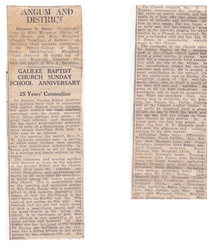 The present chapel was built on a new much larger site in 1904, with red sandstone quarried at Port Lion, and funded by events and donations. The Baptist cause grew in strength in Llangwm and Galilee was noted for its Sunday School anniversaries, harvest festivals, the redoubtable choir, fine congregational singing and, in pre-television days, the Christmas Day concerts.