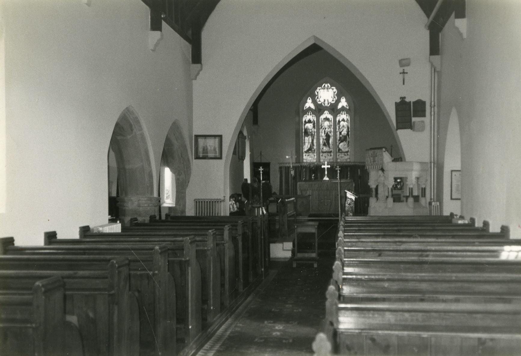 Description: Black and white photograph of the interior of St Jerome’s Church Llangwm detailing the nave and altar.