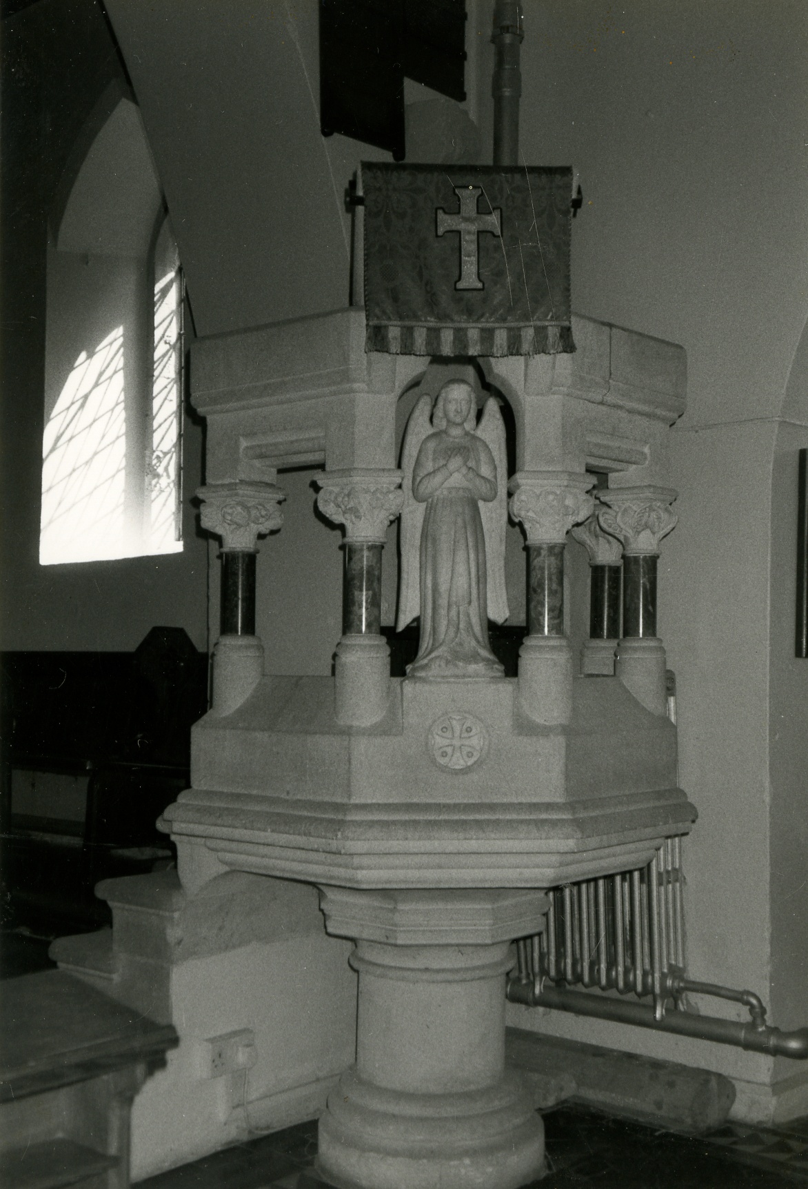Description: Black and white photograph of the pulpit at St Jerome’s Church Llangwm Pembrokeshire.