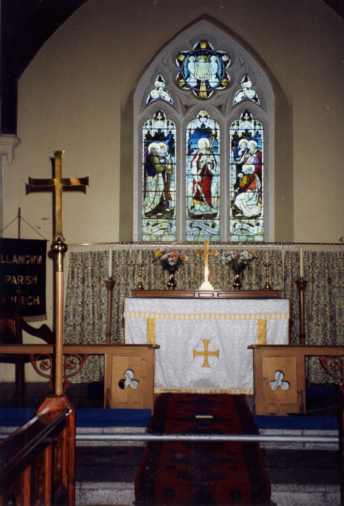 Description: Coloured photograph of the altar and memorial window in St Jerome's Church Llangwm Pembrokeshire.