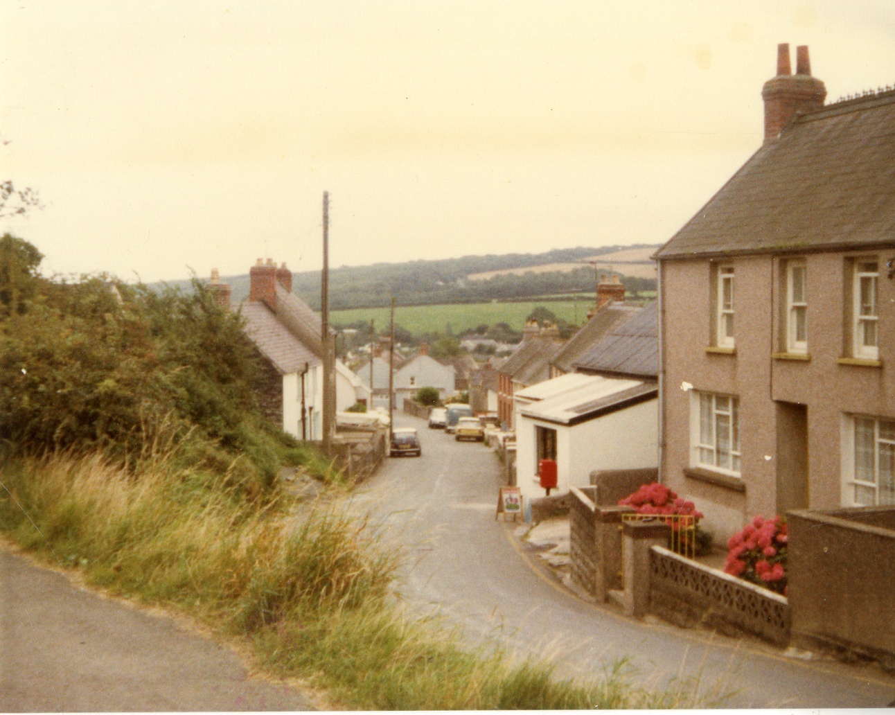 Description: Coloured photograph of Main Street Llangwm showing the shop.