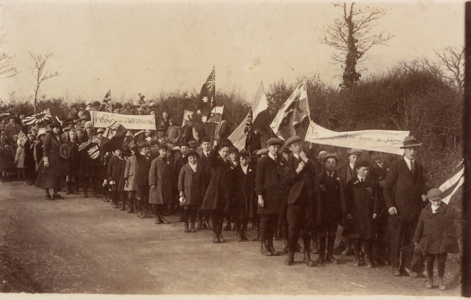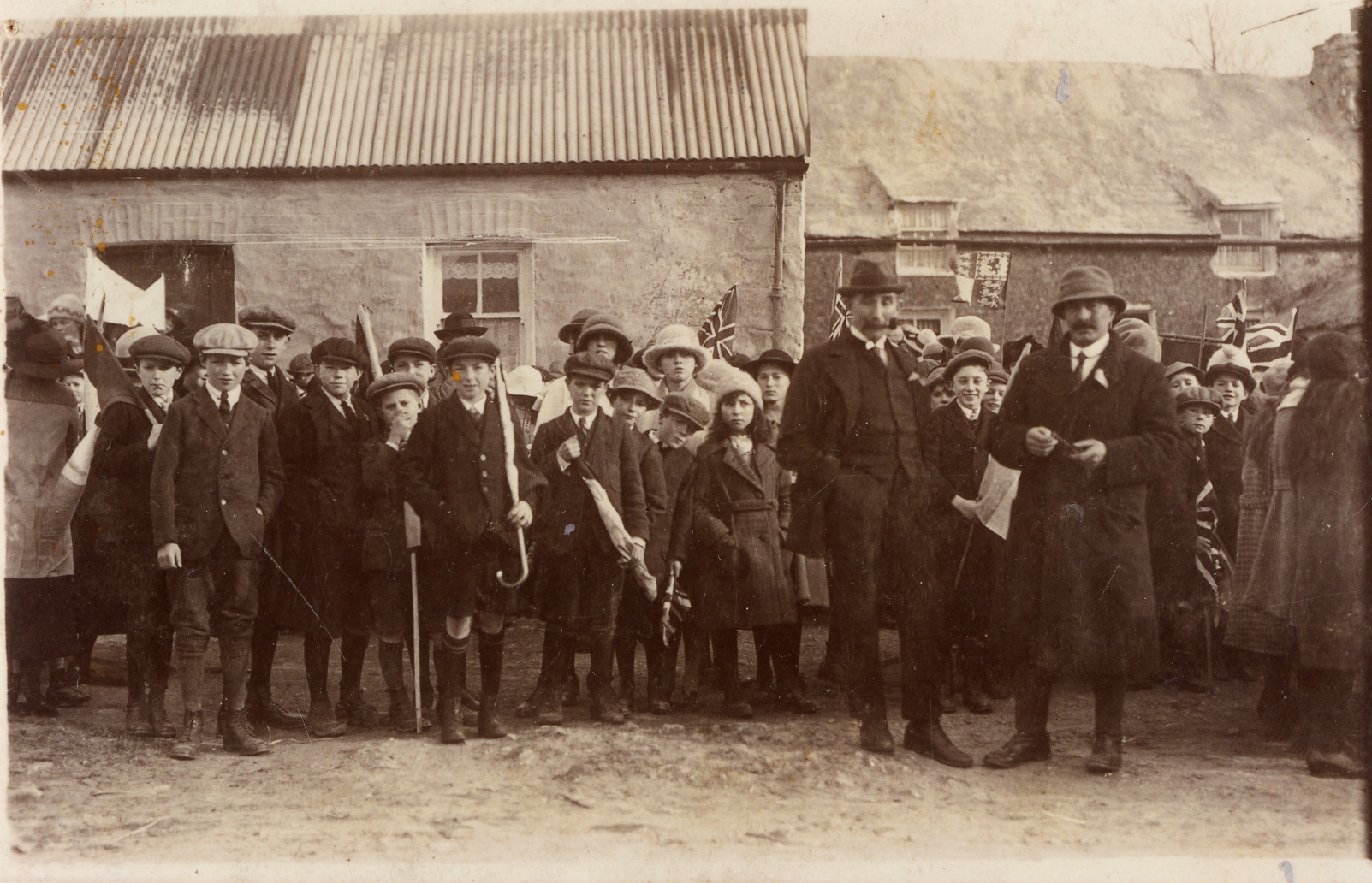 Description: Photograph of Main Street Llangwm showing groups of people mainly children no names. There is a pub in the background but no name to see.