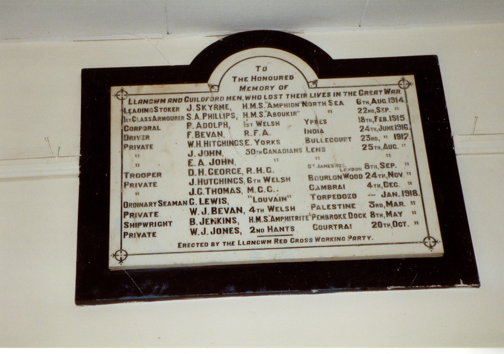 Description: Photograph of the Llangwm World War One Memorial to those who lost their lives. Names mentioned include J Skyrme, S A Phillips, P Adolph, W H Hitchings, J John, E A John, D H George, J Hutchings, J C Thomas, C Lewis, W J Bevan, B Jenkins, W J Jones.