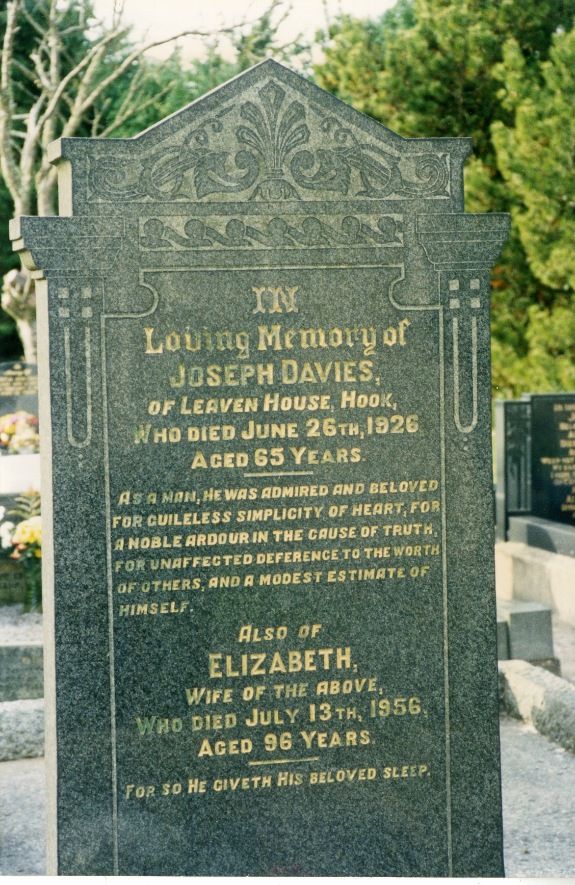 Description: Headstone of Joseph Davies of Leaven House Hook who died June 26 1926 aged 65 years and also of Elizabeth his wife who died July 13 1956 aged 96 years.