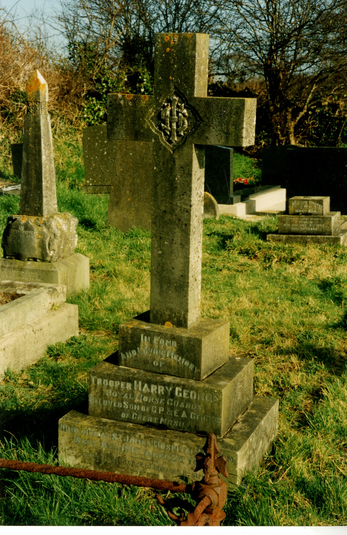 Description: Headstone of Trooper Harry George of The Royal Horse Guards Beloved son of G P and E A George of Great Nash who died at St James Hospital Sept 8 1917 aged 25 years.