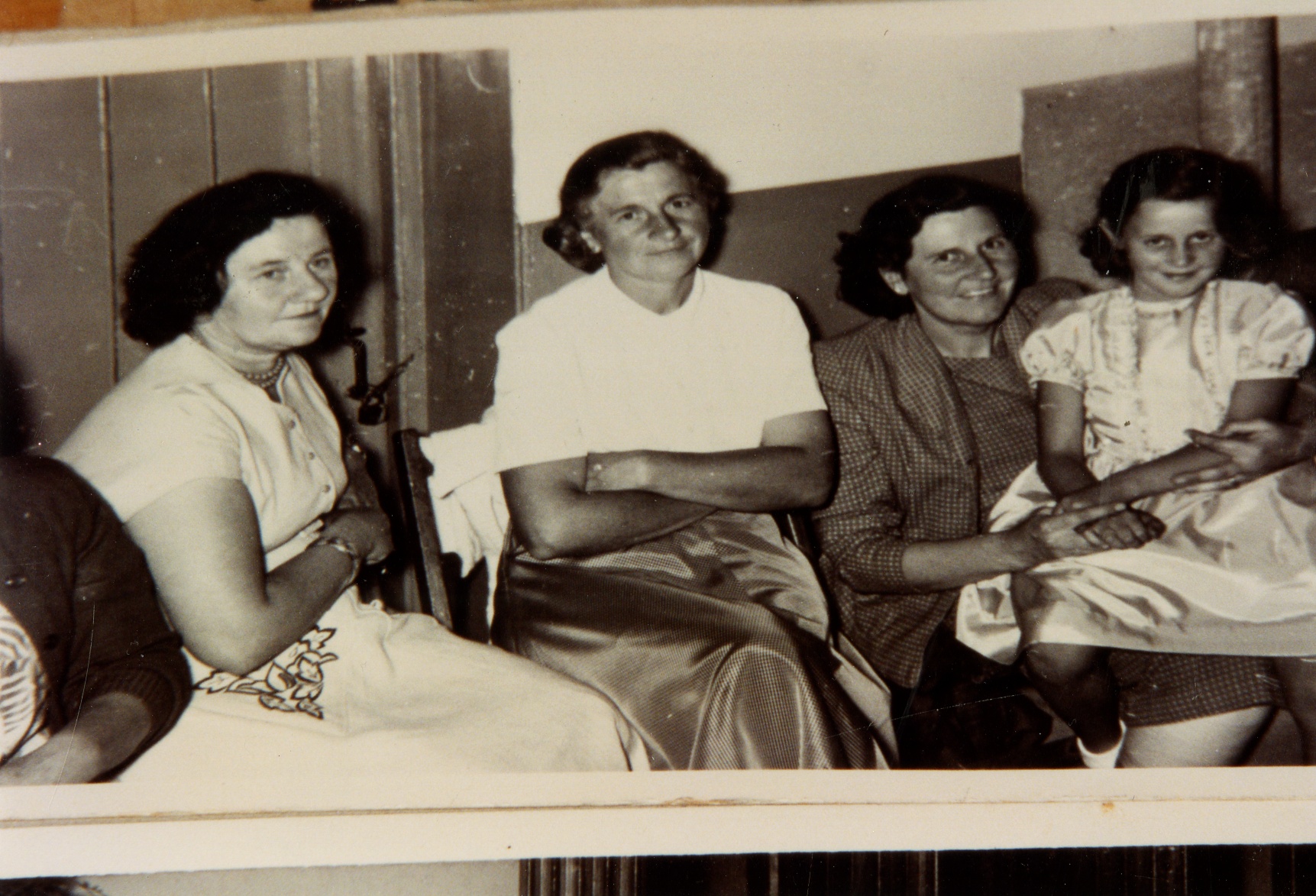Description: Photograph of a group of three ladies and a young lady l – r May Prout who was Maureen Kiff's mother of Brick House Main Street Llangwm, 2 is unnamed, Annie Jacob who was Ian's mother, June Jacob who was Ian's sister.