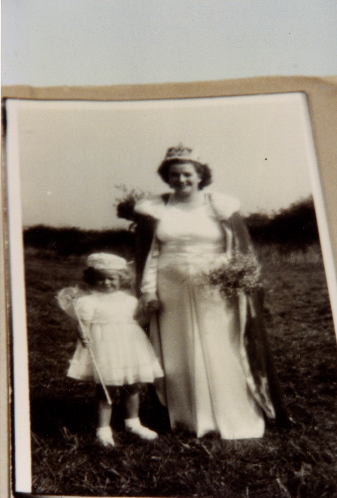 Title: Copy of a photograph taken at Llangwm Carnival Pembrokeshire 1956 of a lady and a small child.