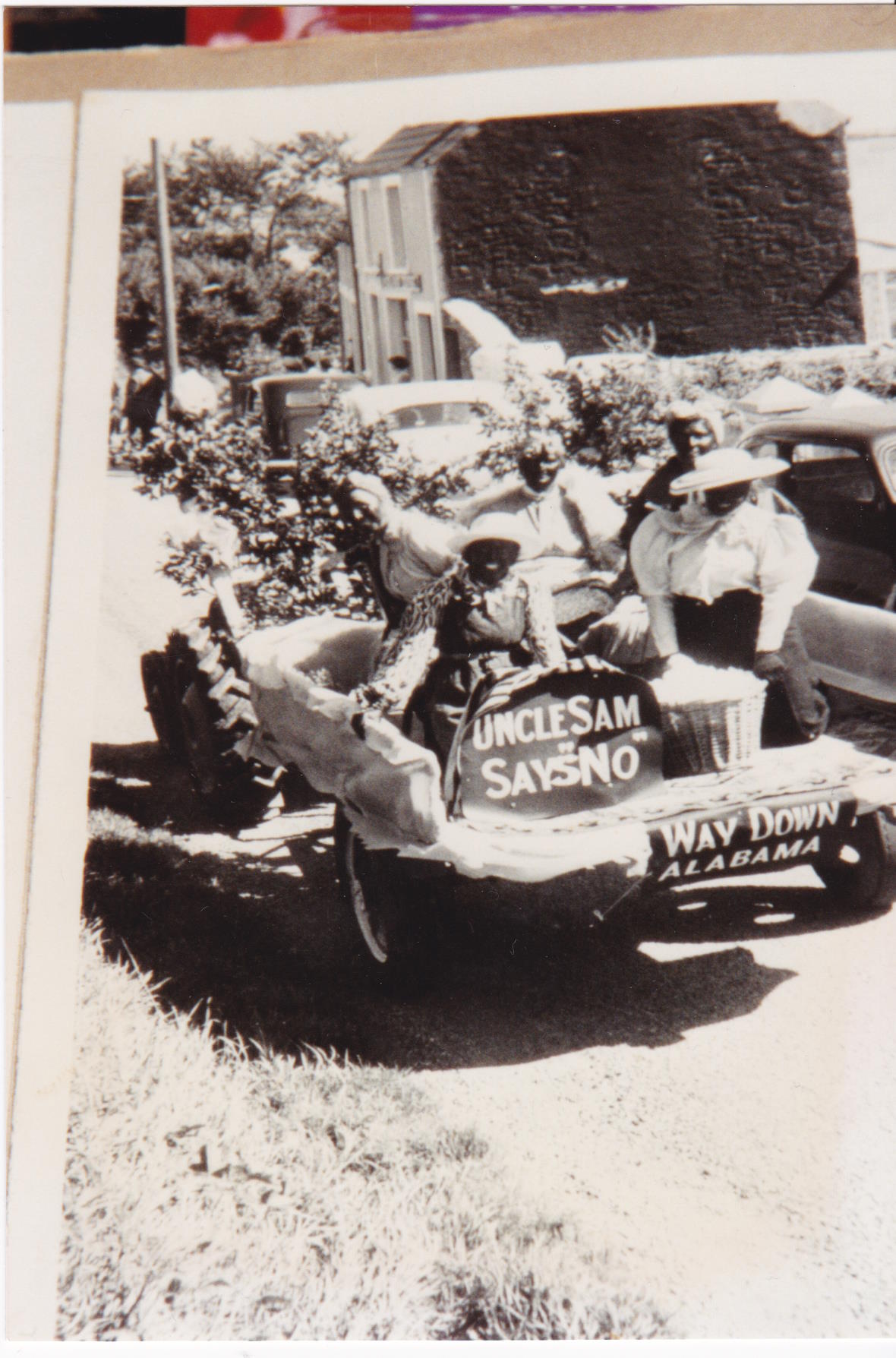 Description: Photograph of an entry for the Llangwm Carnival undated. It appears to be a float of five people pretending to come from Alabama with a sign that says Uncle Sam says No.