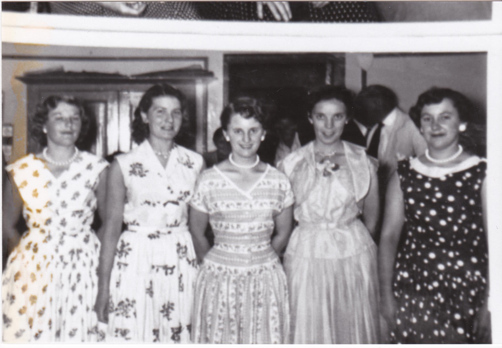 Description: Photograph taken at Llangwm Festival 1952 of a group of five ladies at a meeting l – r Marina Locke from Hook, Jean Davies married Billy Davies who lived in the last council house on Rectory Road, Lorraine James who was one of the Trevithicks who went to live in Hook, Violet Locke who moved to Hook, Catherine Jones who worked in a Swansea Hospital.