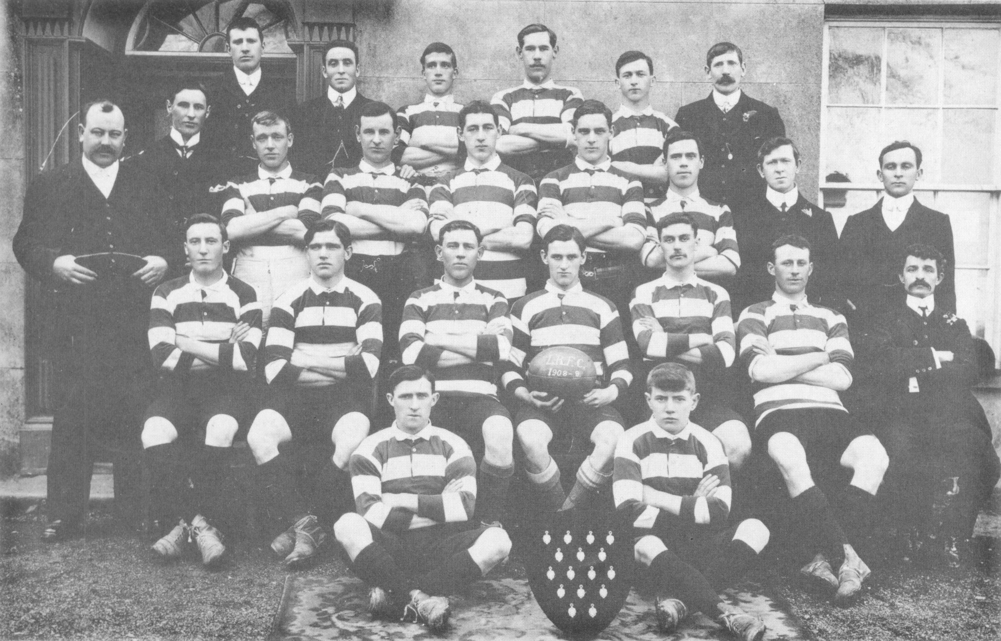 (Third row) F. Evans, W. Hill, Lieut-Col. Lort Phillips (President L.R.F.C.), W. Palmer (Captain), Capt. Hugh Allen (League President), D. Lewis, E. Brock