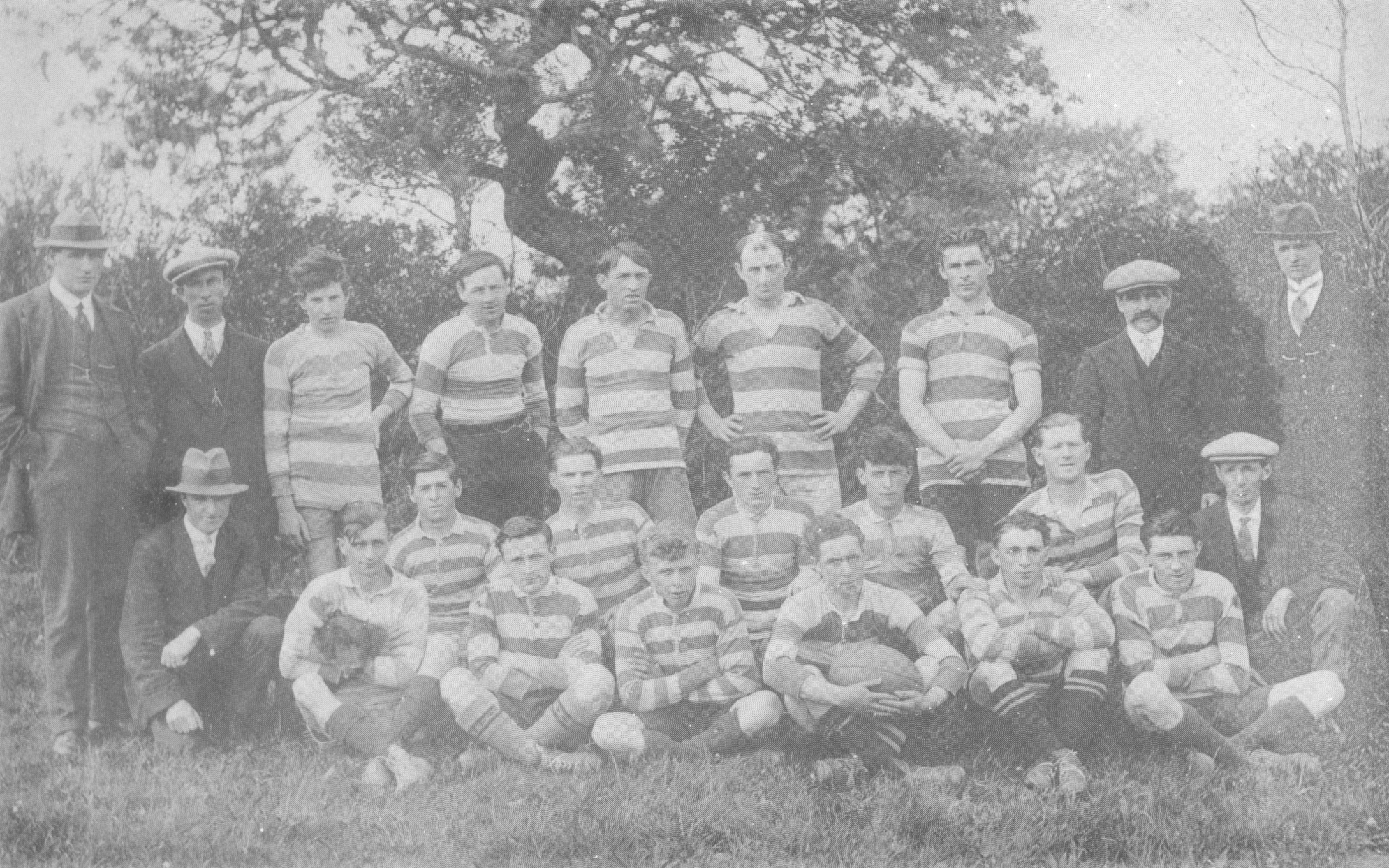 (Back row, l. to r.) Mr. F.G. Phillips (W.R.U. Ref., Pontardulais), Mr. T.E. Phillips (Hon. Secretary), R.G. Roberts, J. Griffiths, G. Brook G. Kiff,
