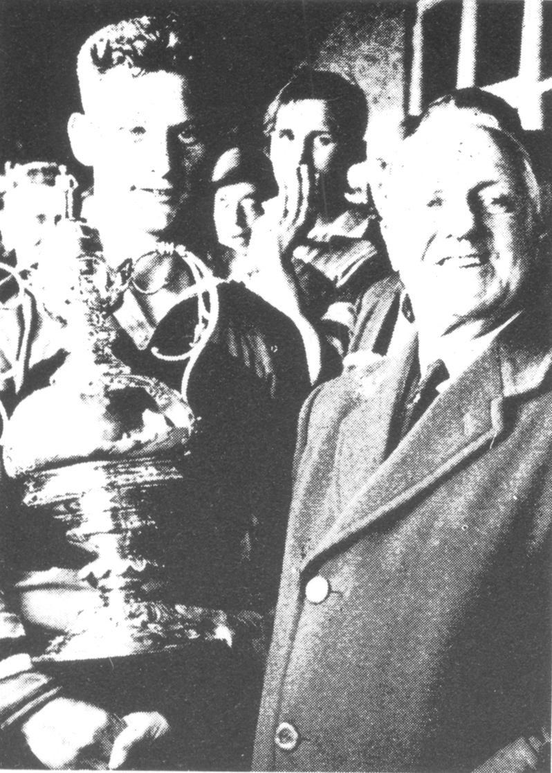 A jubilant George Thomas waves high the 1959-60 "Pembrokeshire Knock-out Cup"