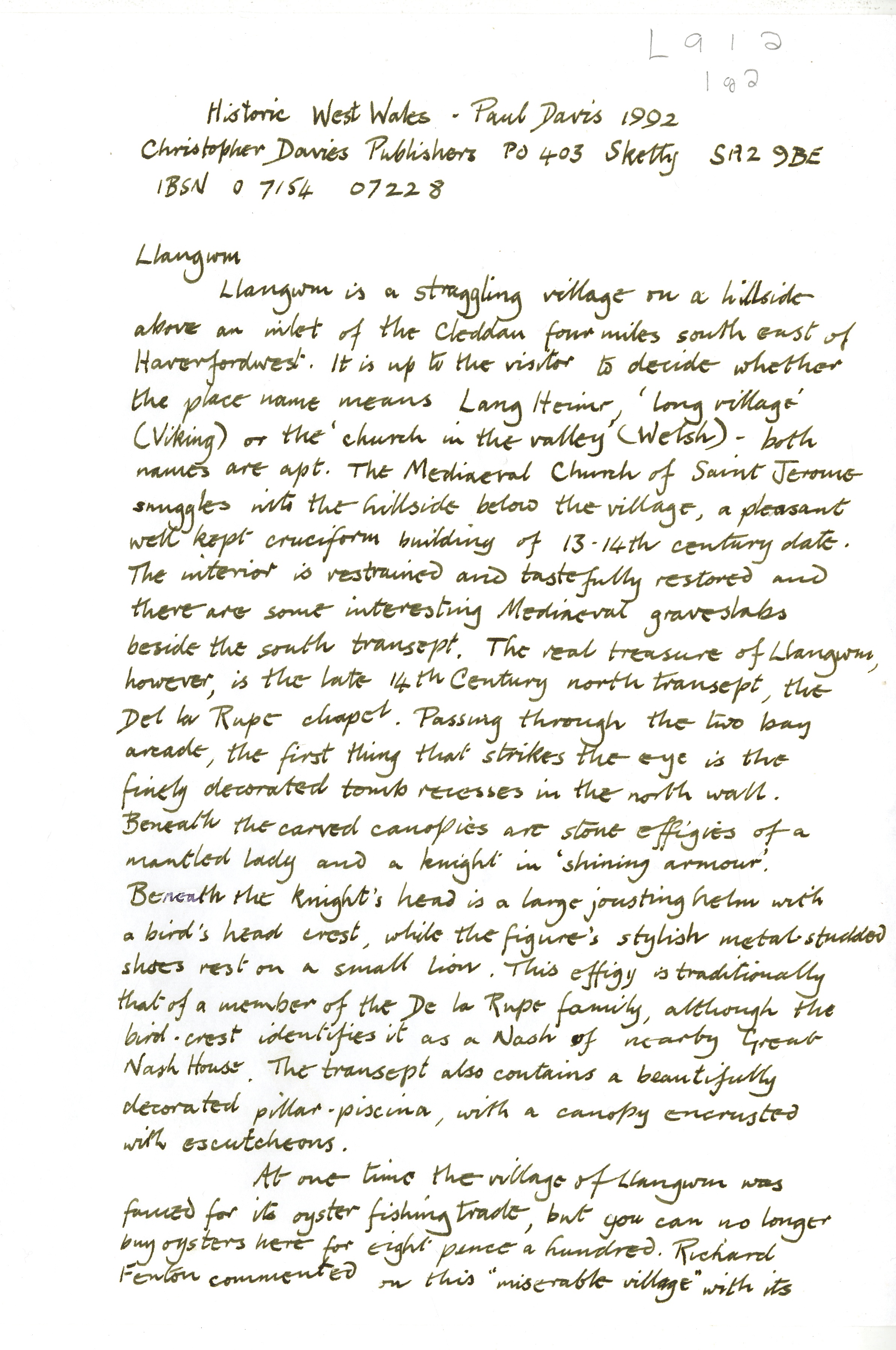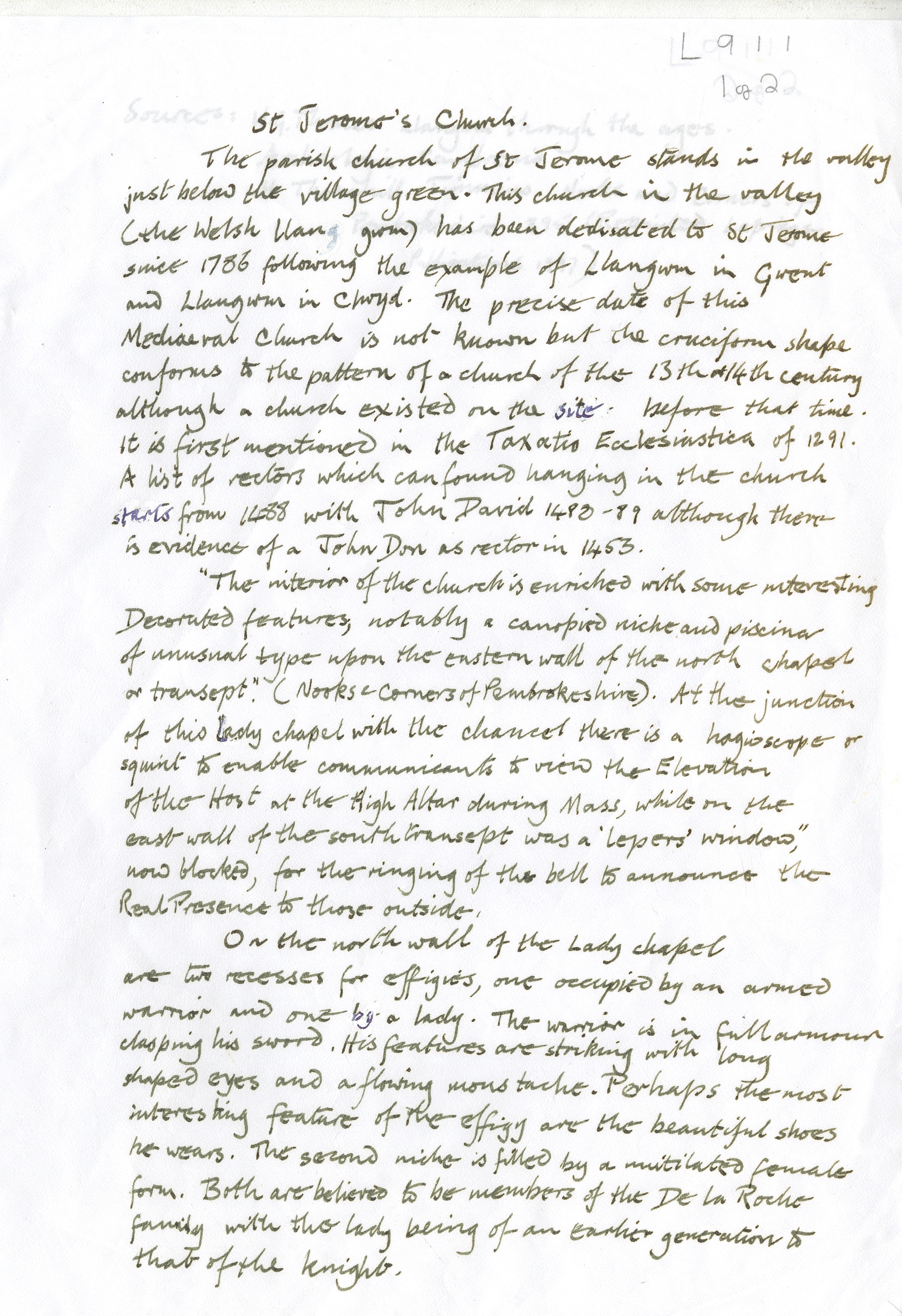 Description: Handwritten notes on St Jerome's Church and additional brief notes on the geographical location of Llangwm. Sourced from Nooks and Corners of Pembrokeshire 1885, reprinted 1997. pages 178-9. 1 item.