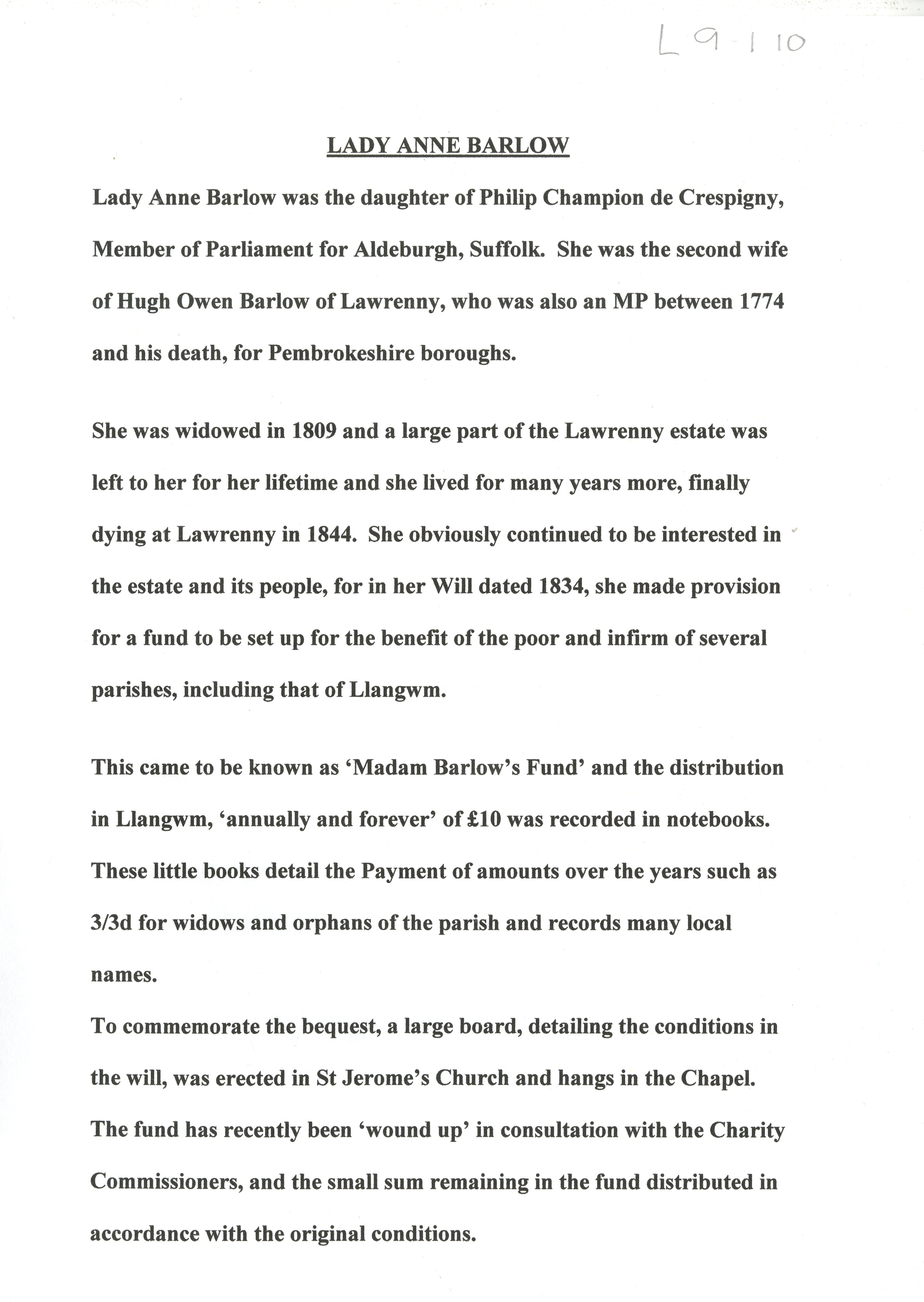 Description: Printed page of information regarding Lady Anne Barlow, 'Madam Barlow's Fund' and its distribution in Llangwm. Also provides detail of a board detailing the bequest that formerly hung in the parish Church. 1 item.