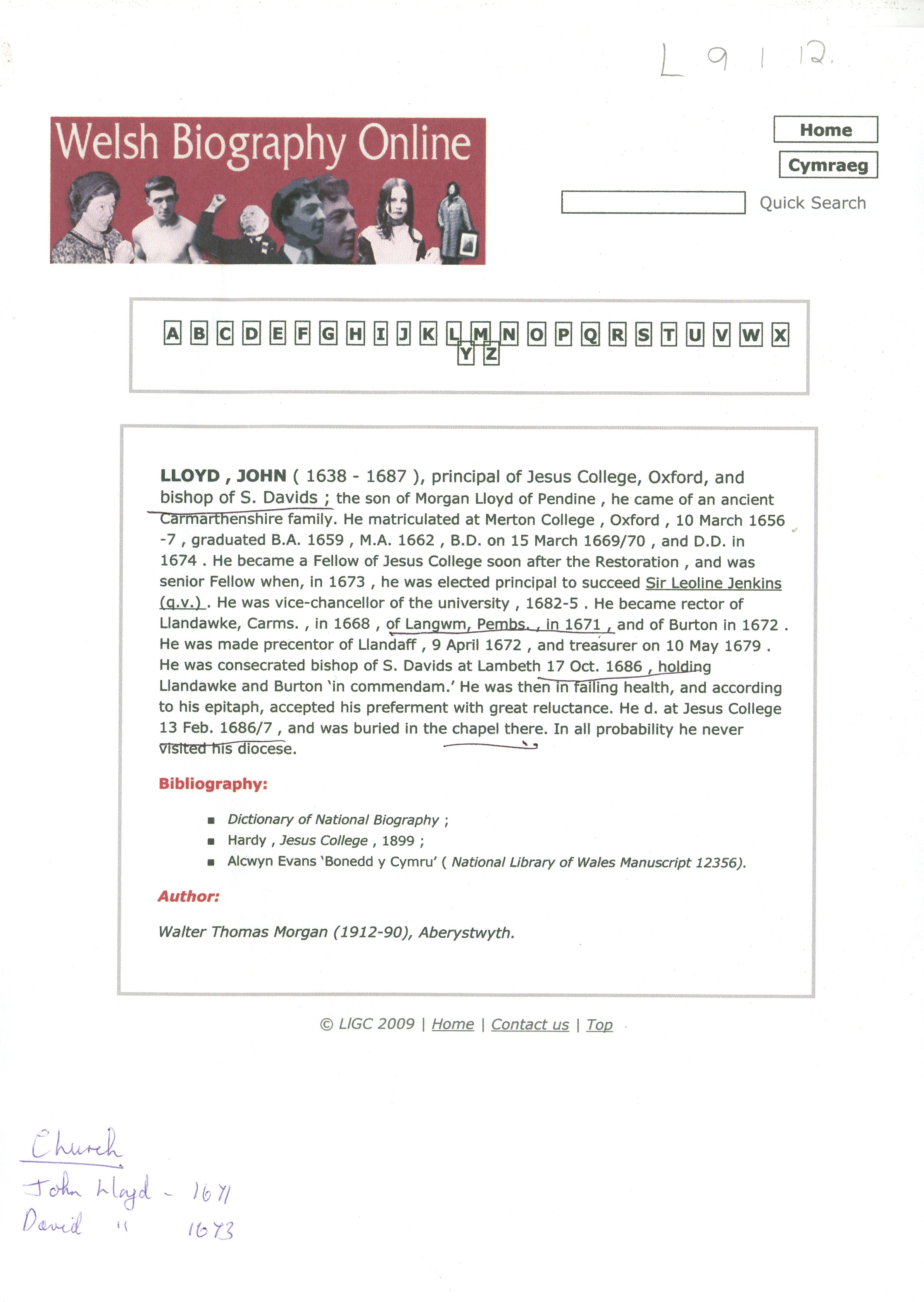 Description: Print out of information regarding John Lloyd 1638-1687, Bishop of St Davids and former Rector of Llangwm from Welsh Biography Online. Original author Walter Thomas Morgan (1912-1990), Aberystwyth. 1 item.