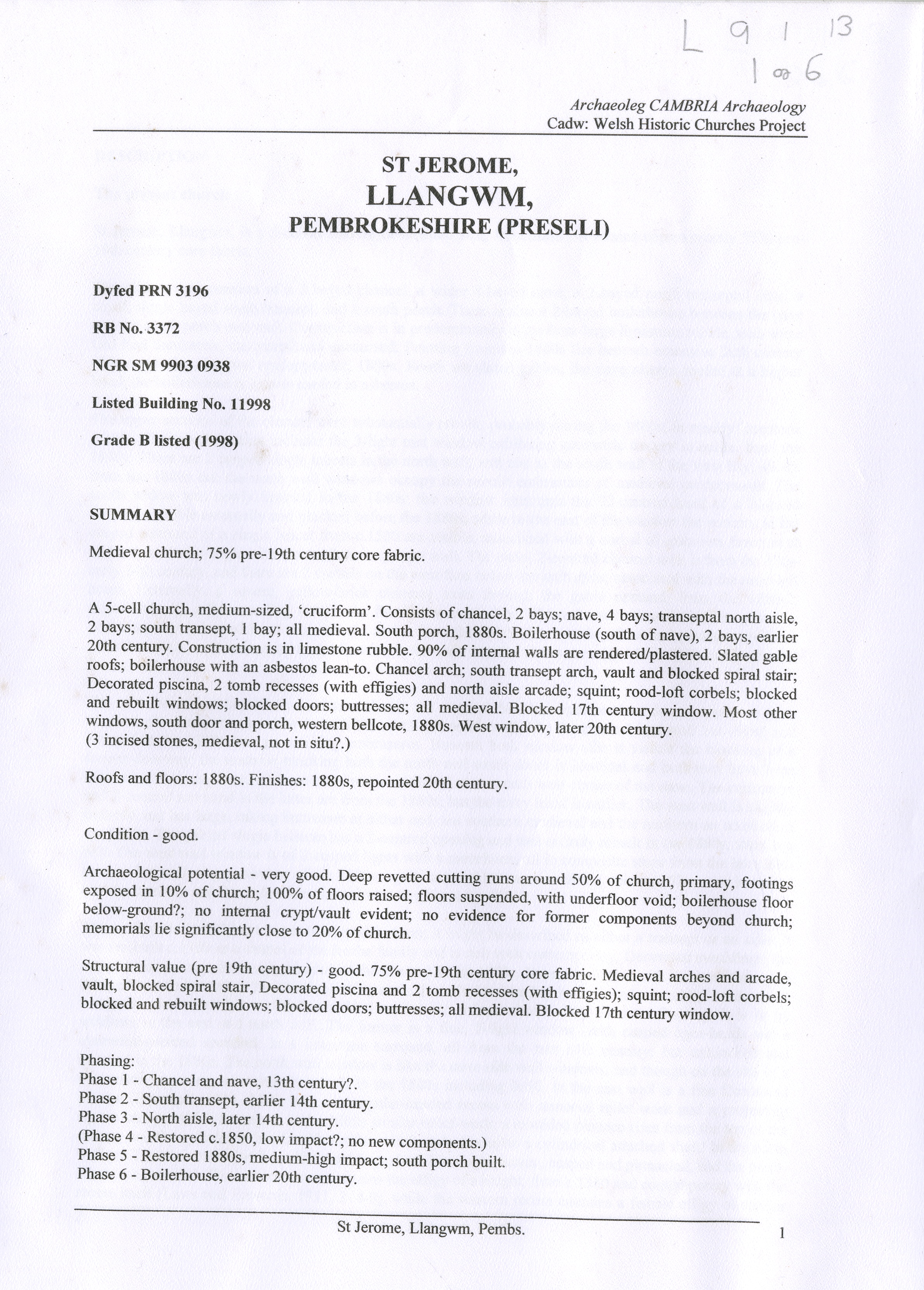 Description: Print of the CADW schedule of St Jerome, Llangwm as part of the CADW Welsh Historic Churches Project. 1 Item provides detailed information regarding the fabric and features of the building it's Grade B listing date and Listed Building Number.