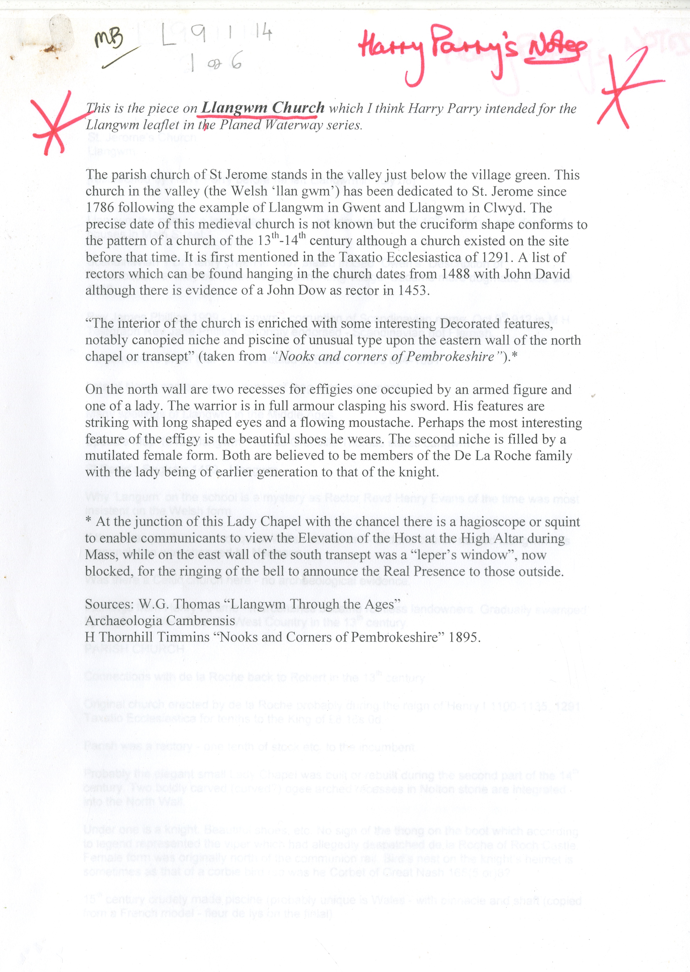 Description: File of notes on Llangwm Church compiled by Harry Parry. The file includes a typed page of information which is noted as believe intended for the Llangwm leaflet in the PLANED Waterway series. Information is included in the notes on the potential origins of the name Llangwm, brief notes on de la Roche links, certain Rectors, Sunday School and details of Church fabric and features from Arch Camb etc. Sources of information provided. Document is initialled 'MB'. 1 File.