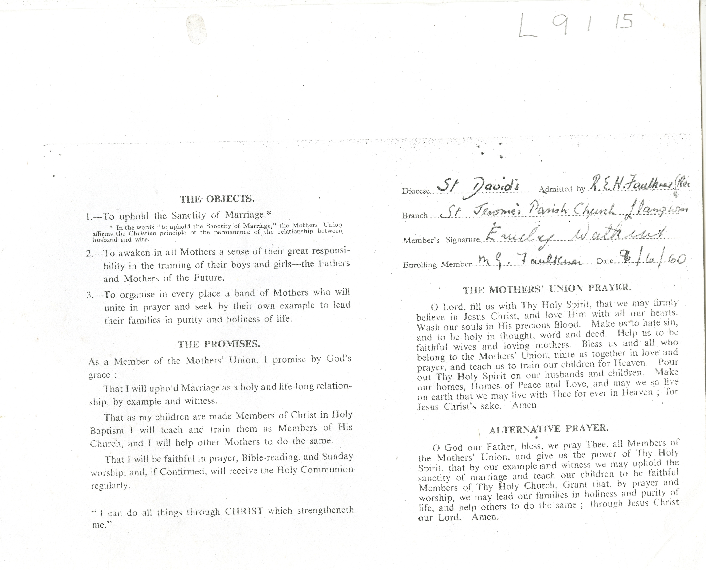 Description: Copy of Mothers Union admission certificate for an admission at St Jerome’s' Church, Llangwm, detailing the organisations objectives, promise and prayers. 1 item.