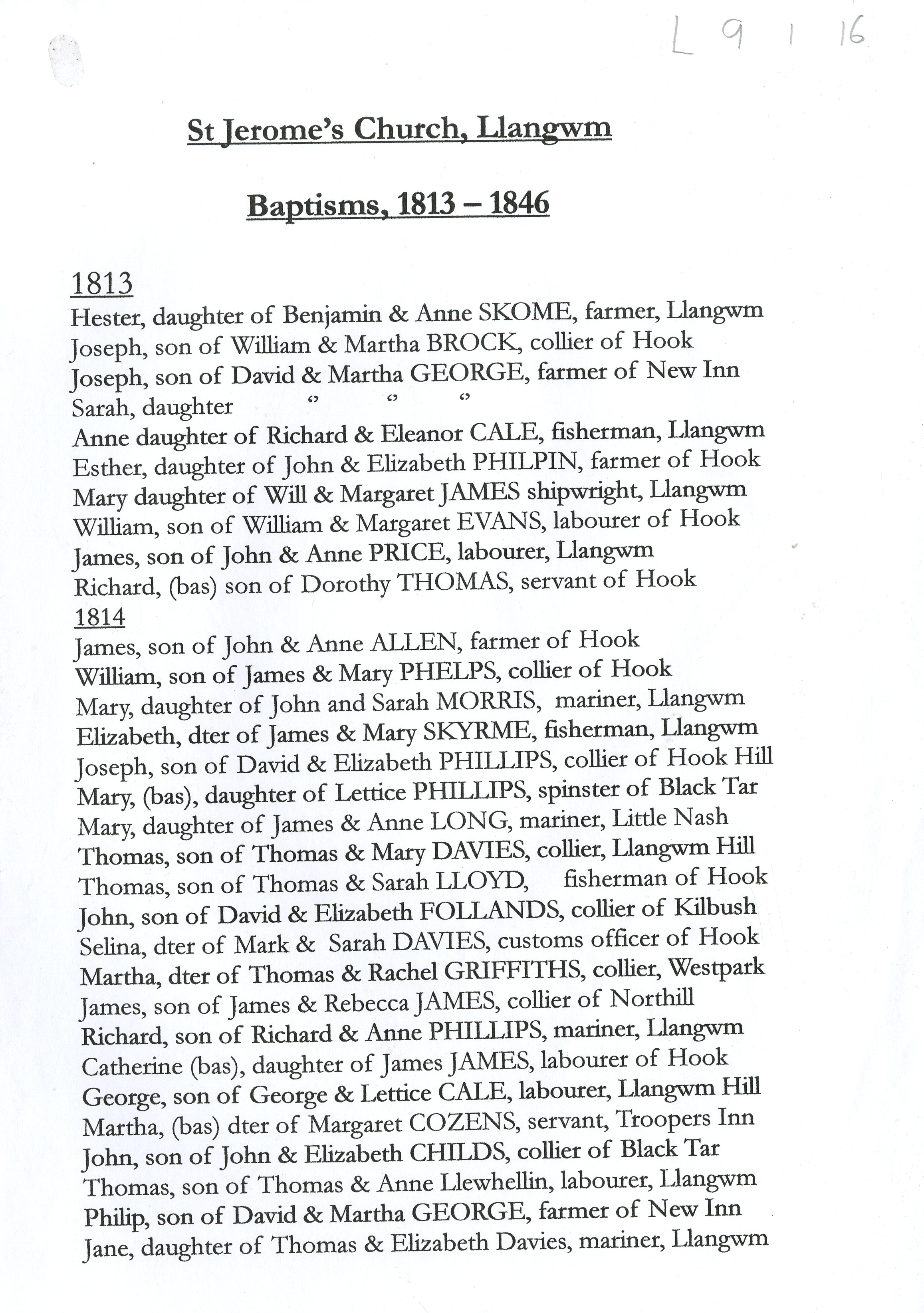 Description: Single page list of Baptisms at St Jerome’s Church Llangwm entitled 'Baptisms 1813-1846' but comprising only a single page detailing Baptisms in 1813 and 1814.