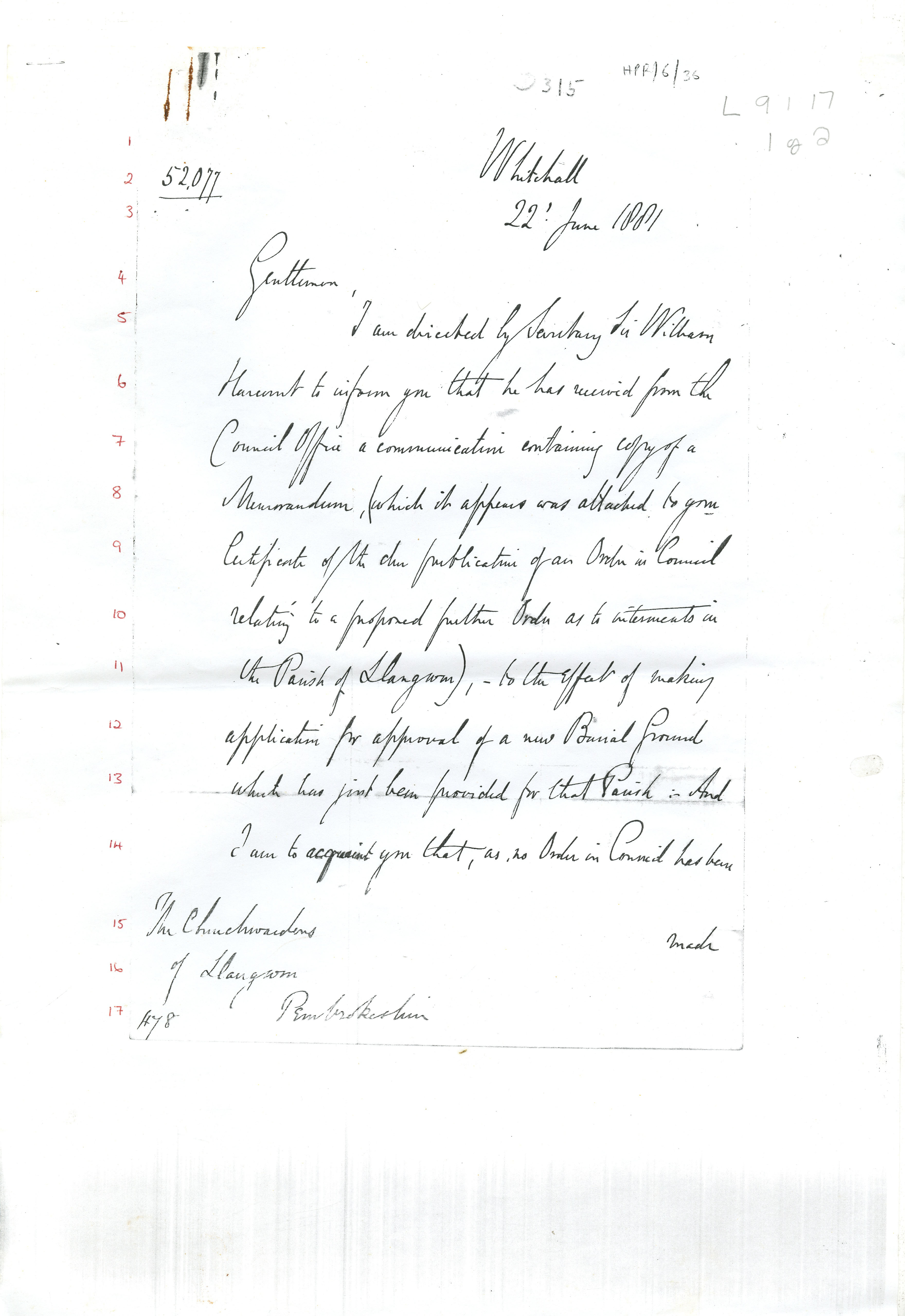 Description: Copy correspondence from the Home Office to the Churchwardens of St Jerome's Church, Llangwm regarding the application for the approval of a new burial ground. Original item held at Pembrokeshire Archives, their reference HPR/6/36. 1 item.