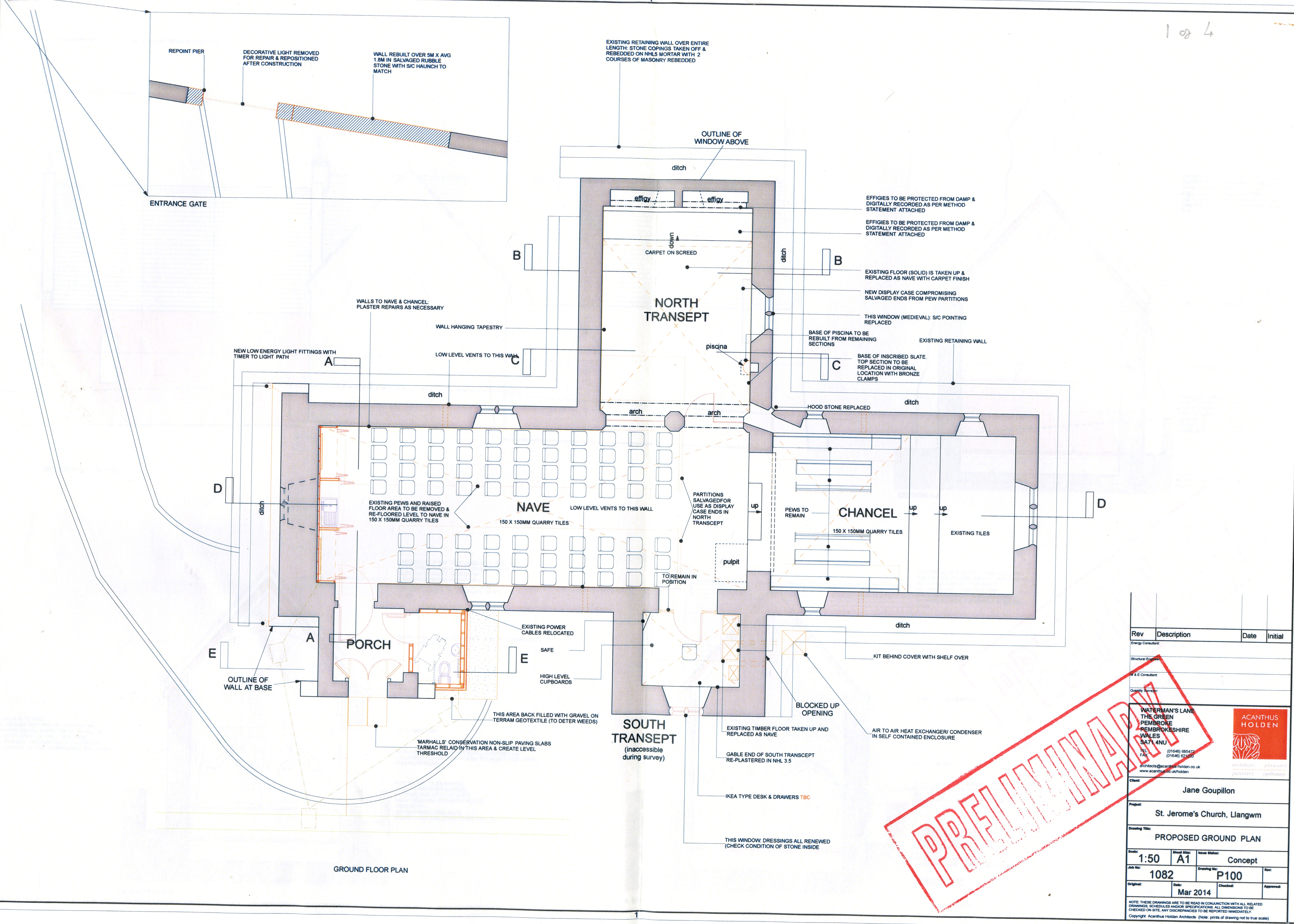 Description: Detailed plans of St Jerome's Church including both the interior ground floor plan and exterior plans. The plans are marked as 'Preliminary' and appear to detail potential works to be undertaken. 1/50 scale.