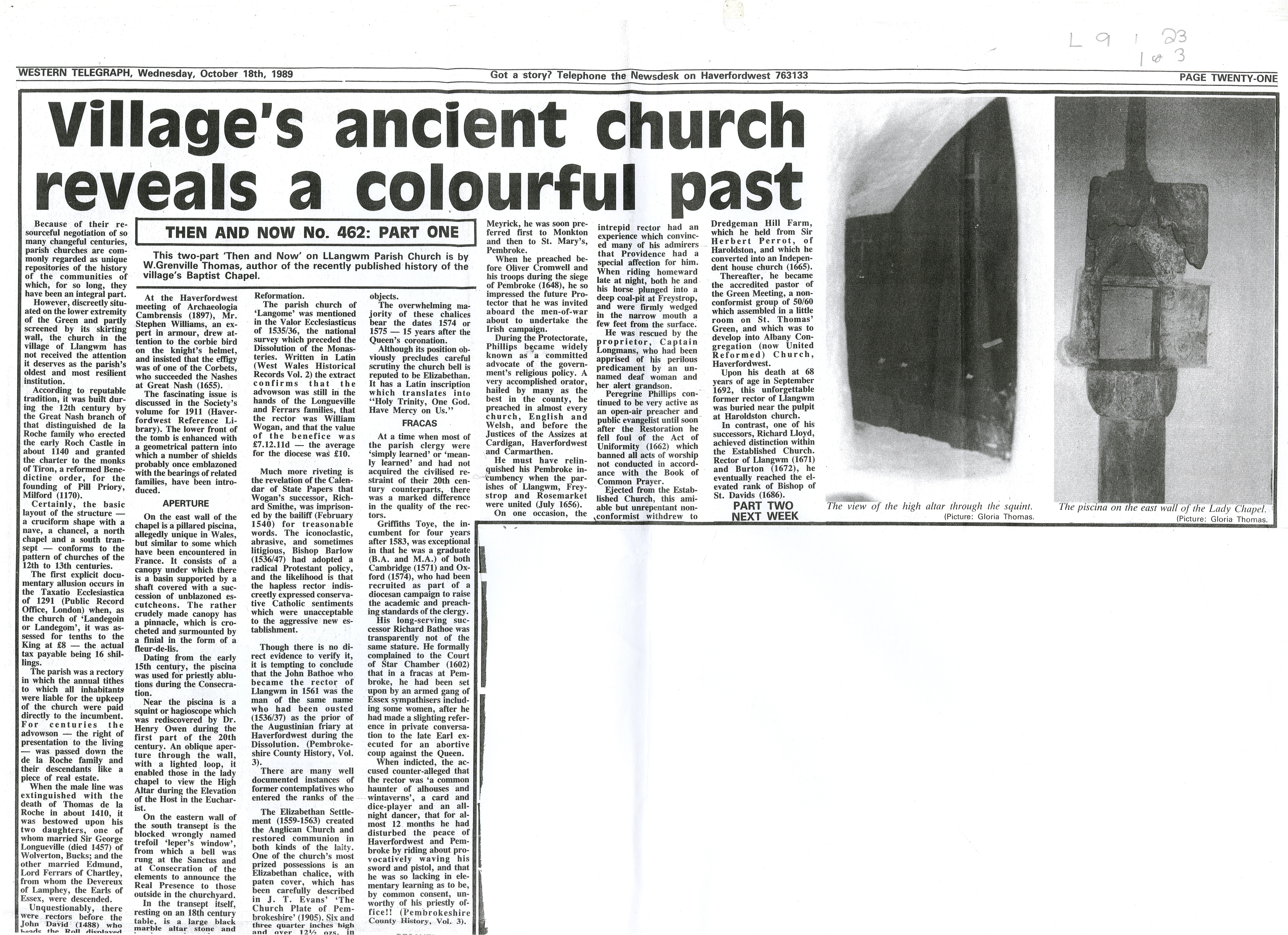 Title: Village's Ancient Church reveals a colourful past'. Copy of Western Telegraph Then and Now article 462.