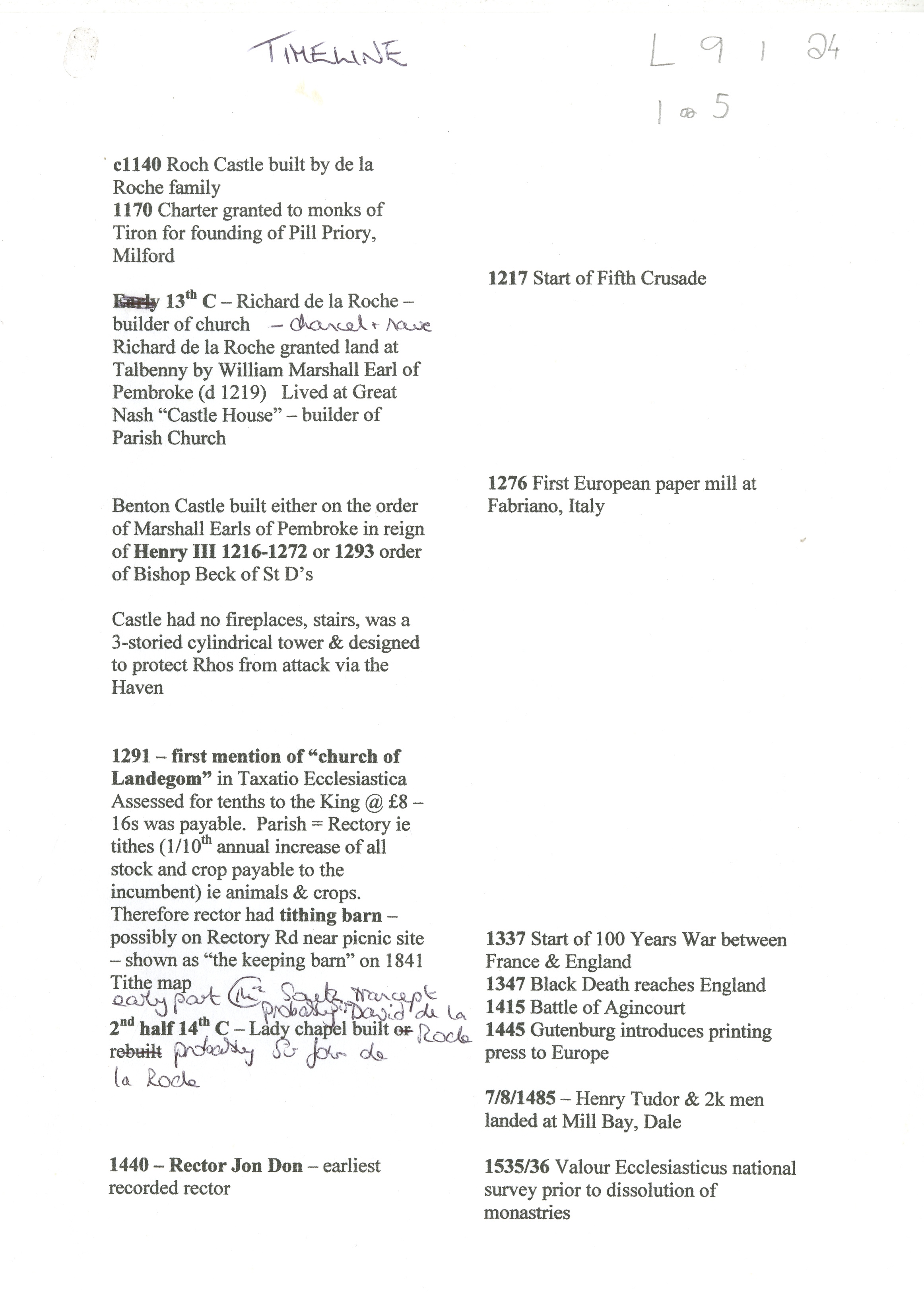 Description: Brief timeline of events in Llangwm including those related to Church and Rectors compared against national and international events c.1140-1920.