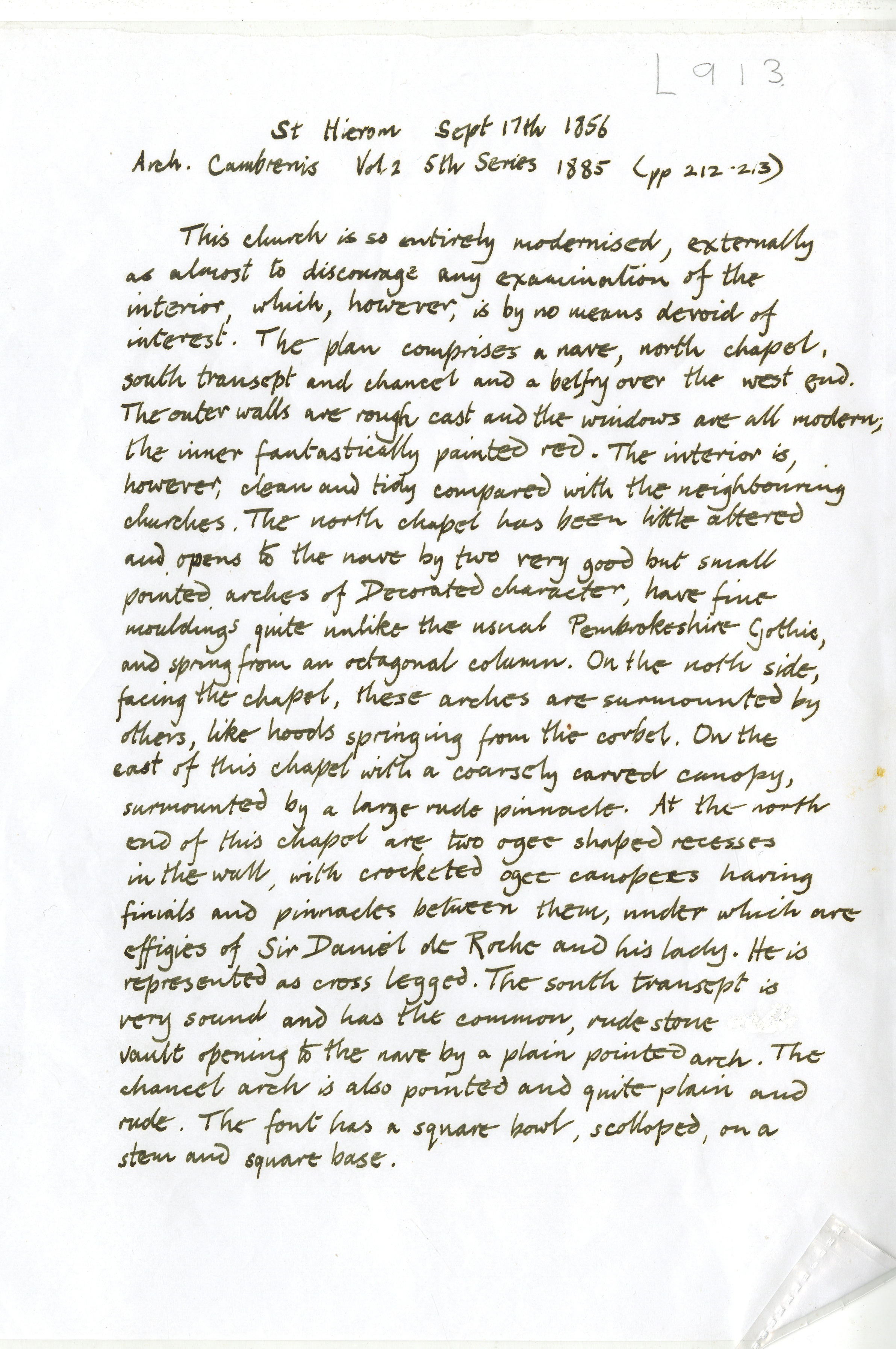 Description: Brief handwritten notes on St Jerome's Church regarding internal architectural features. Obtained from Arch Camb Vol X 6th Series, 1910 p.319. 1 item.