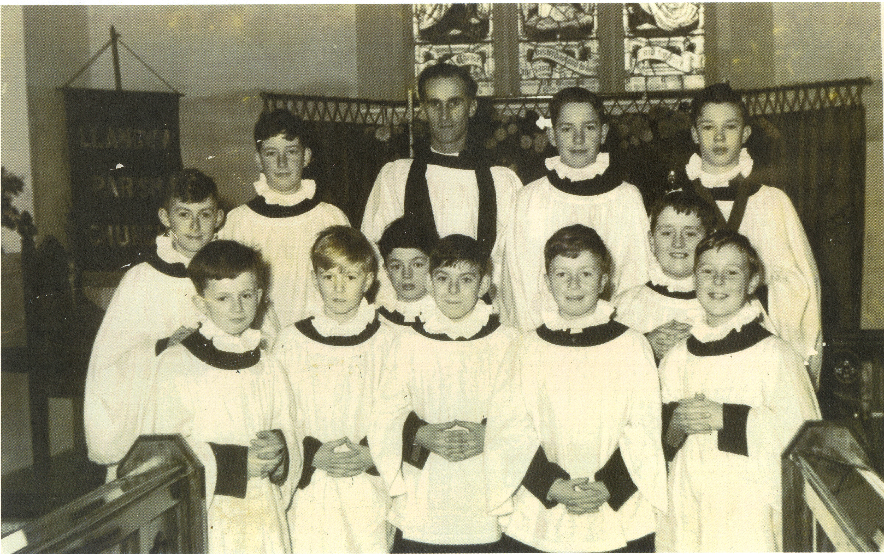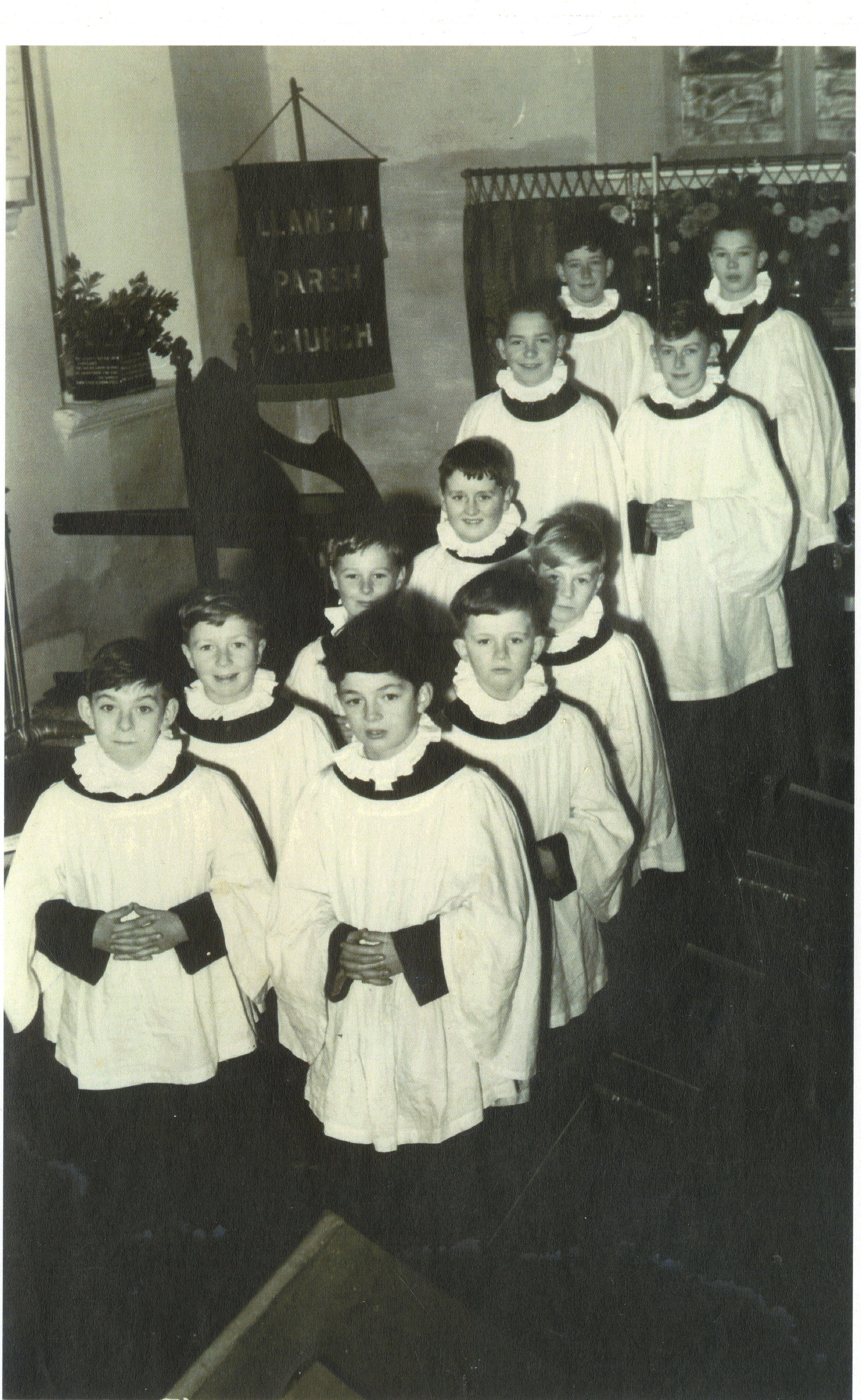 Description: Copy of a photograph of eleven choirboys at St Jeromes Parish Church Llangwm Parish Church.