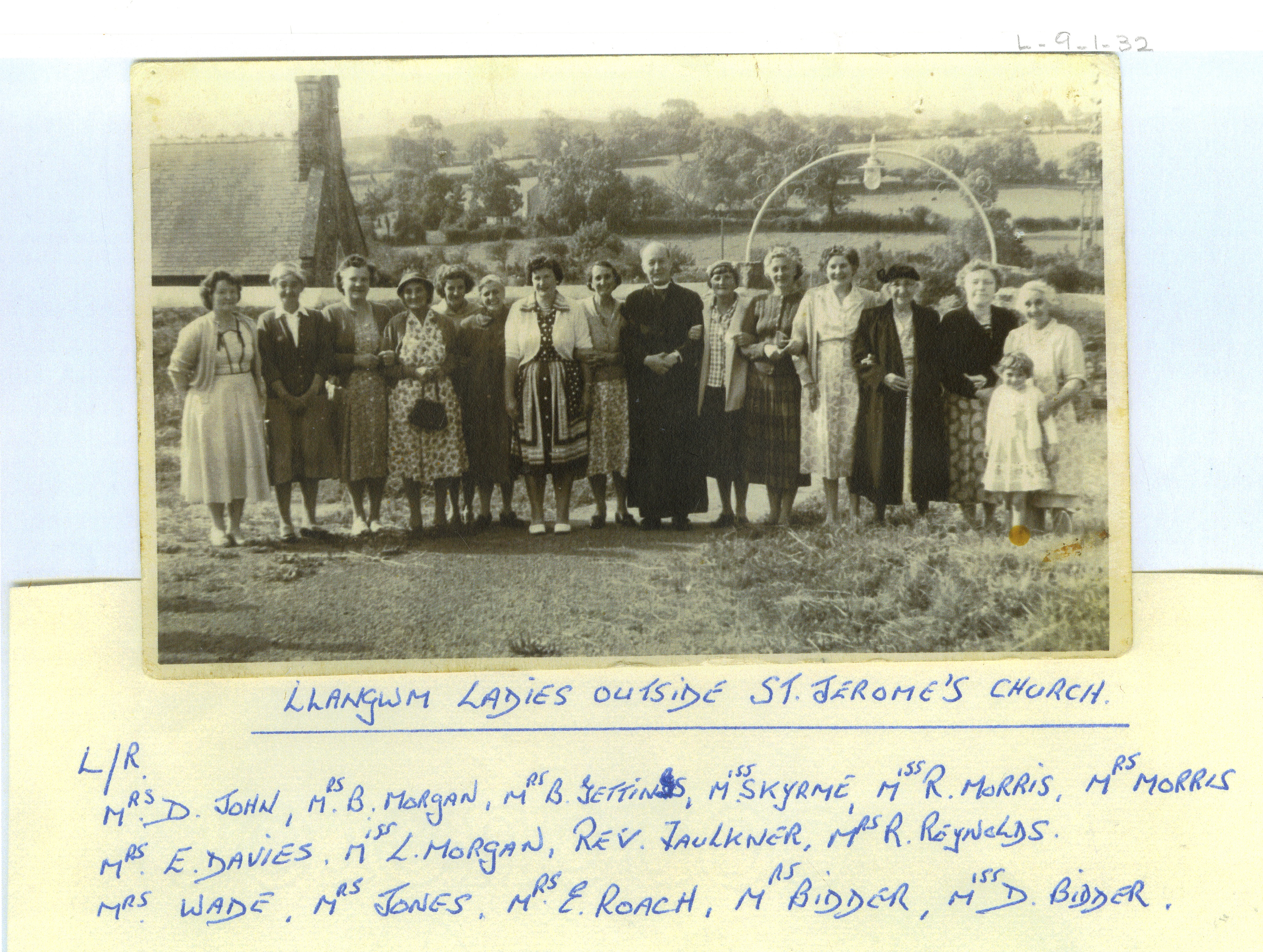 Description: Copy of a photograph taken outside St Jerome's Church Llangwm Pembrokeshire. The Llangwm Ladies are named from left to right Mrs D John, Mrs B Morgan, Mrs B Gettins, Miss Skyrme, Miss R Morris, Mrs Morris, Mrs E Davies, Miss L Morgan, Rev Faulkener, Mrs R Reynolds, Mrs Wade, Mrs Jones, Mrs E Roach, Mrs Bidder, Miss D Bidder.