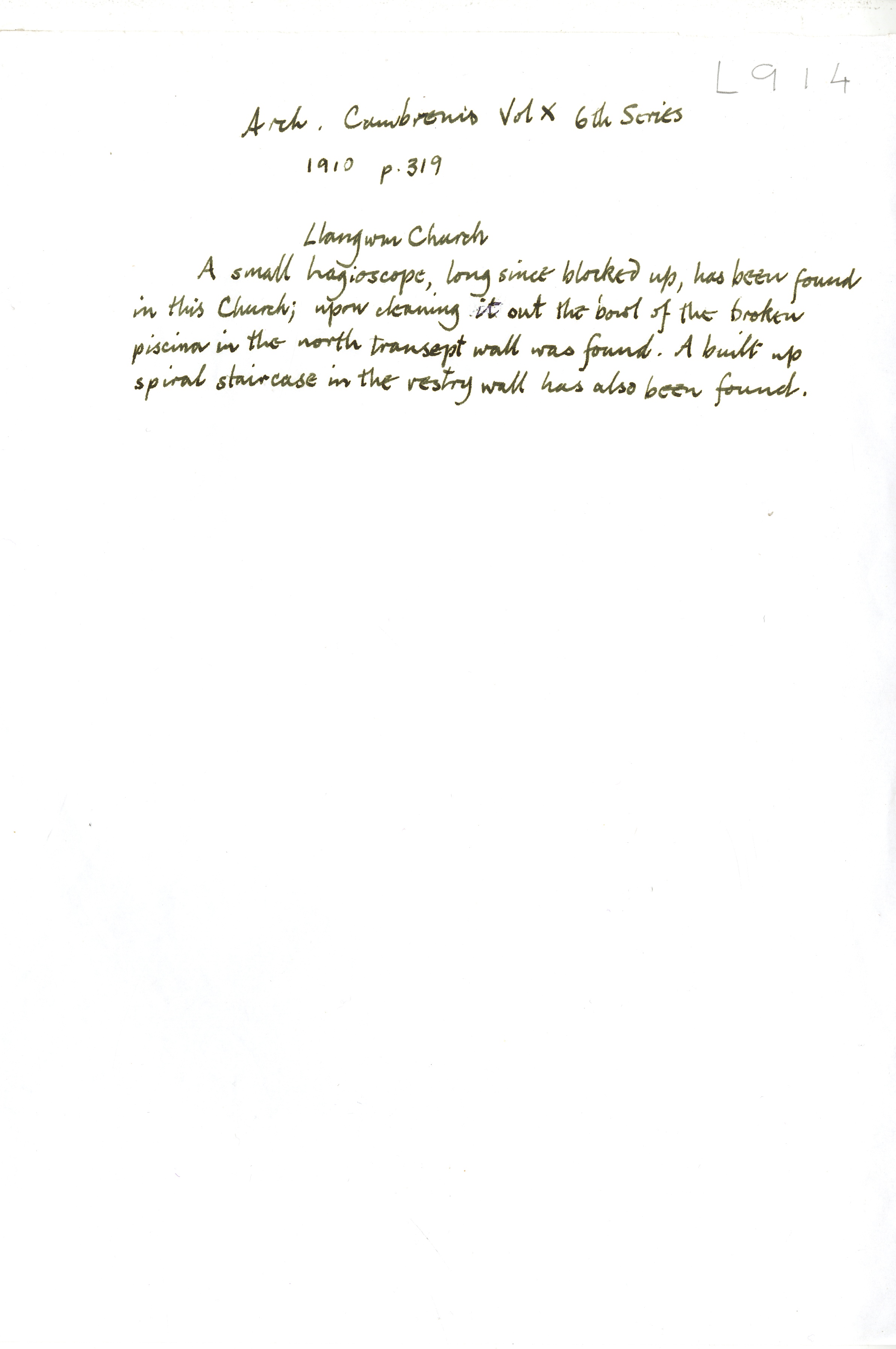 Description: Handwritten notes on the history of Llangwm featuring details of the location and internal architectural features of the building. Source of information given. 1 item.