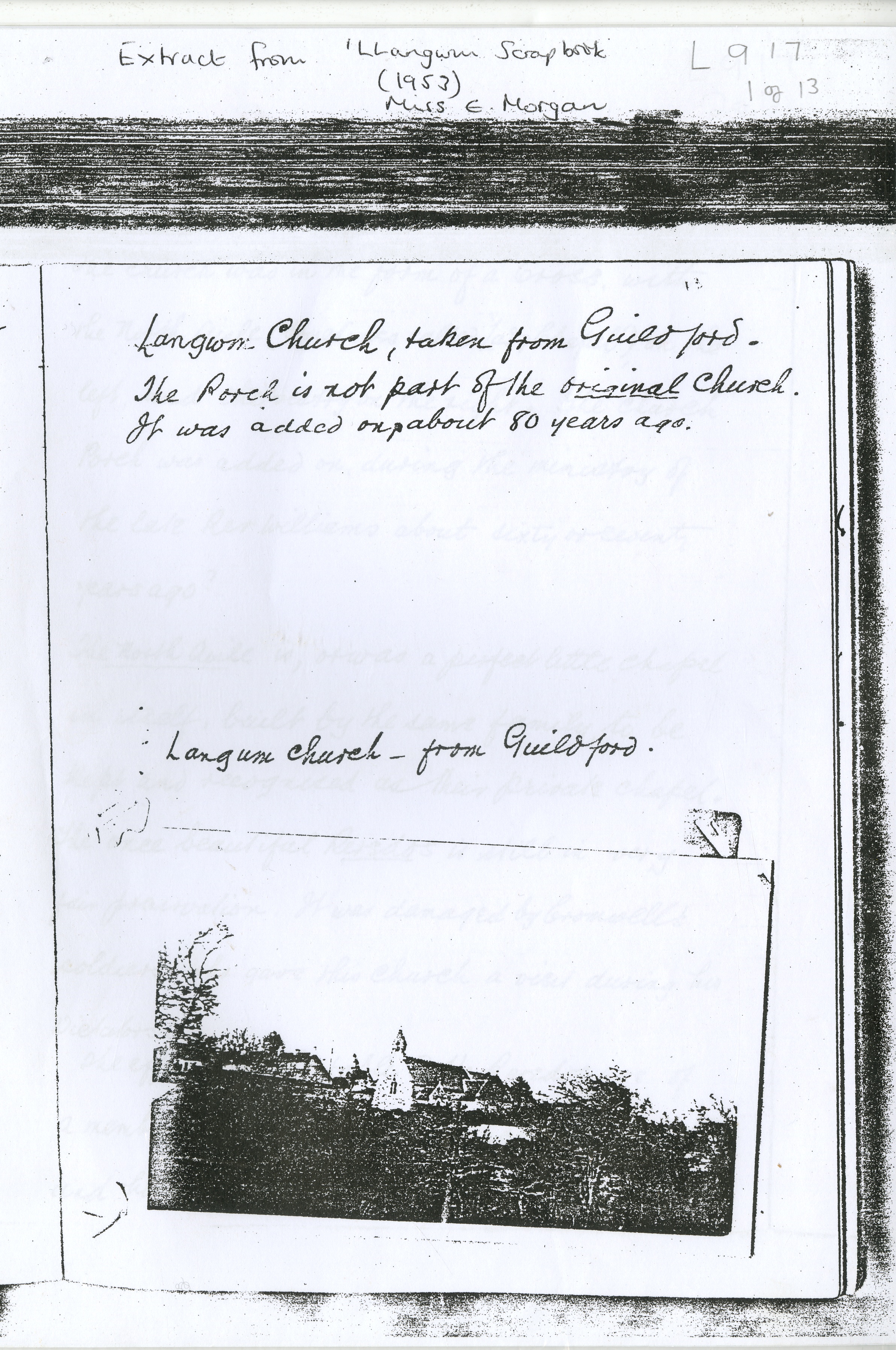 Description: Photocopy document extracted from the Llangwm Scrapbook (1953) detailing the history of the Church including links to the de la Roche family, architectural features and damaged caused during the Civil Wars. Also includes very low resolution photocopy images of the Church and architectural features. Llangwm Scrapbook complied by Miss E Morgan. 1 file.