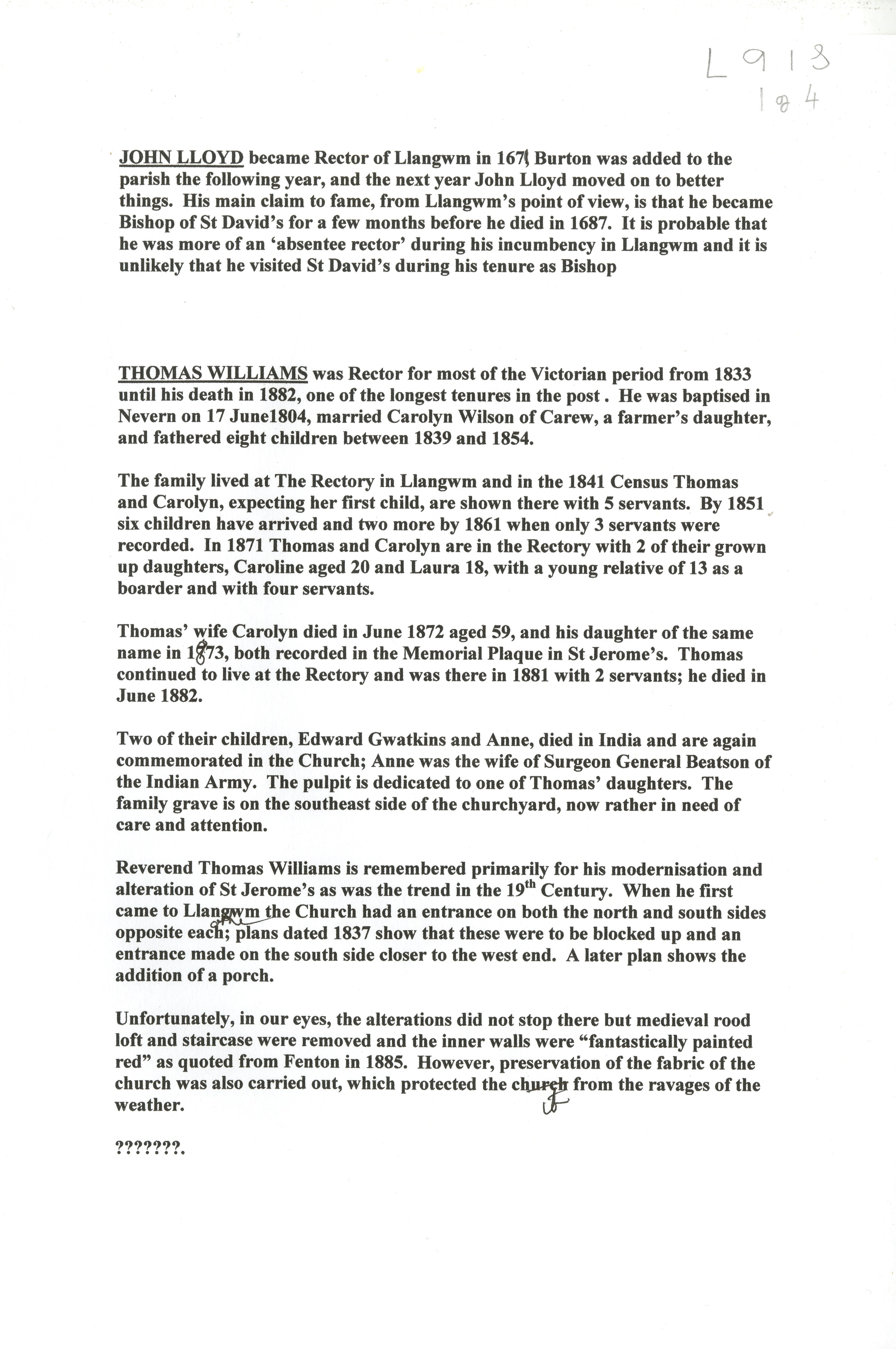 Title: Print out of information on John Lloyd, former Rector Llangwm.