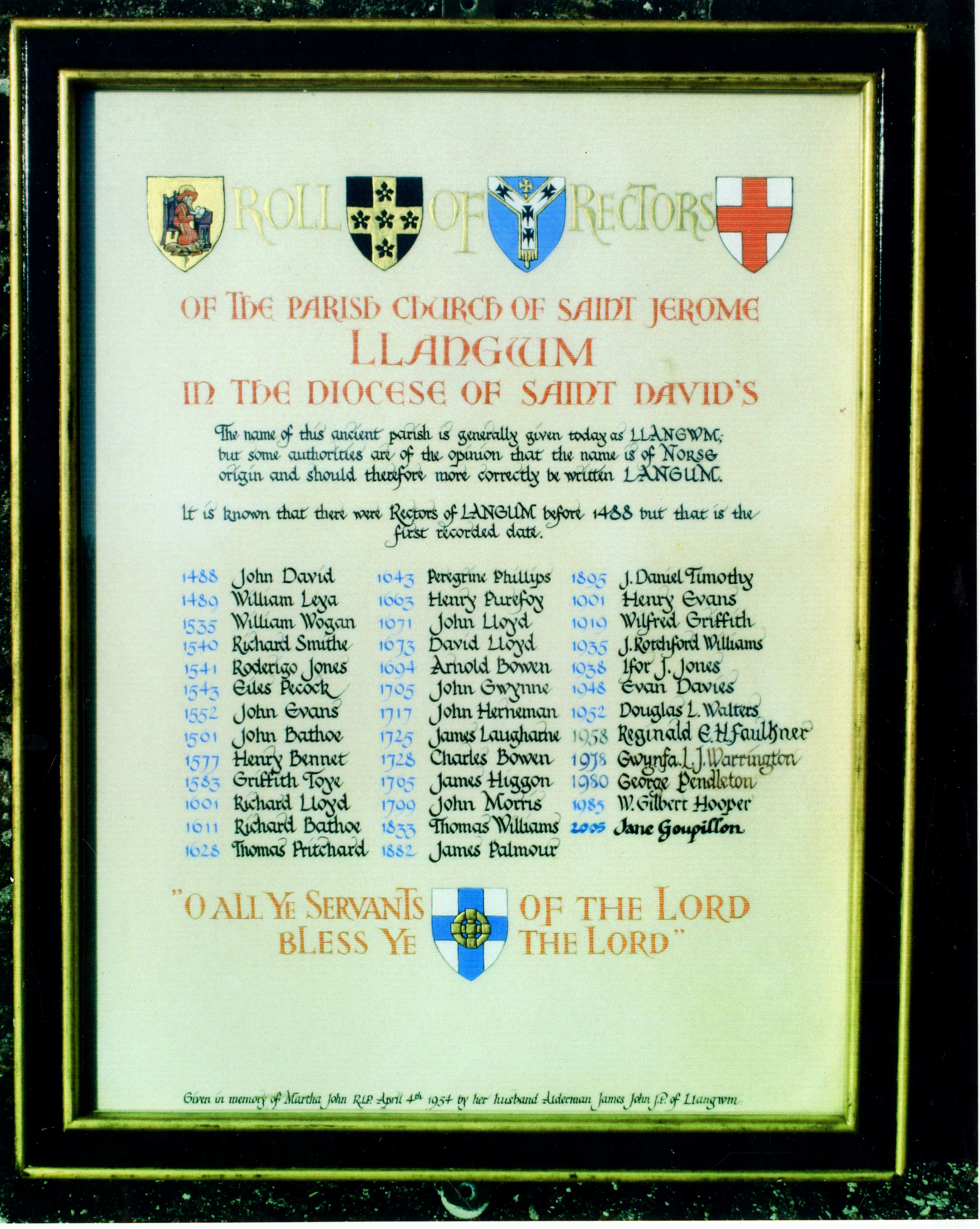 Description: Colour print out of photograph of the Roll of Rectors of Llangwm Parish covering the period 1488-2005. 1 item.