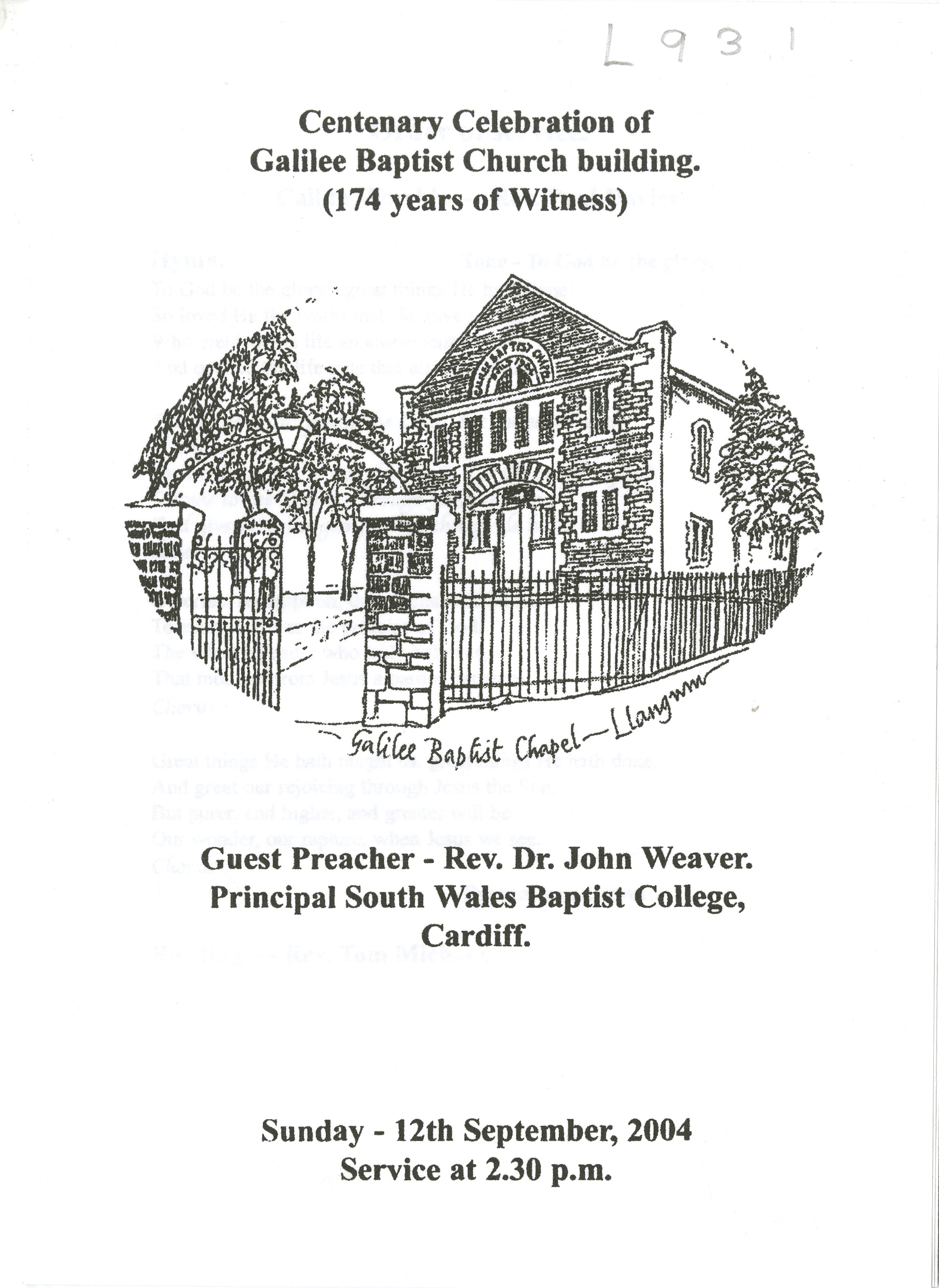 Description: Commemorative booklet for Galilee Baptist Church, Llangwm centenary celebrations led by guest preacher Reverend Dr John Weaver, Principal, South Wales Baptist College. Booklet features programme of service including hymns and includes copy drawing of the Chapel on front cover. 1 Item.