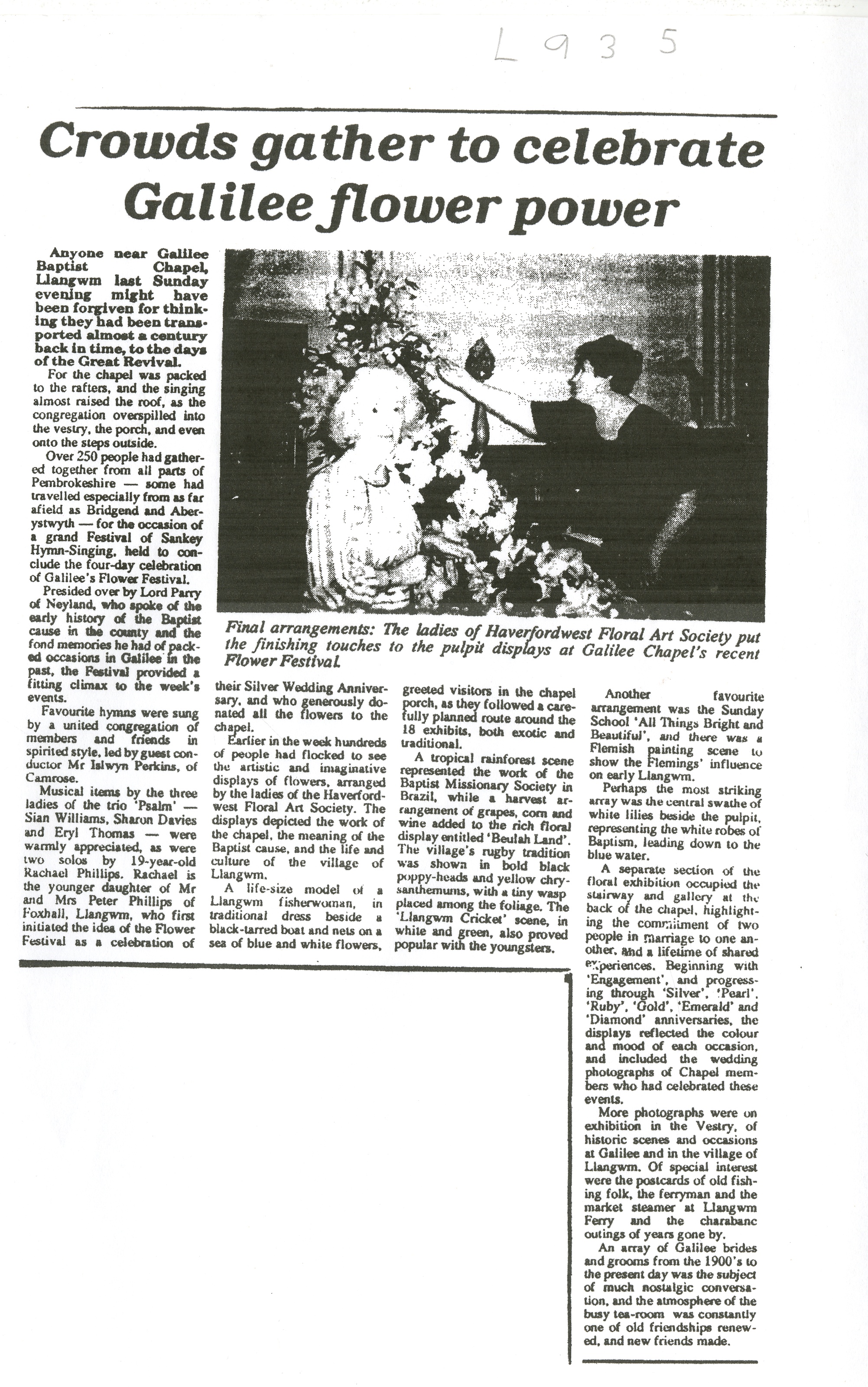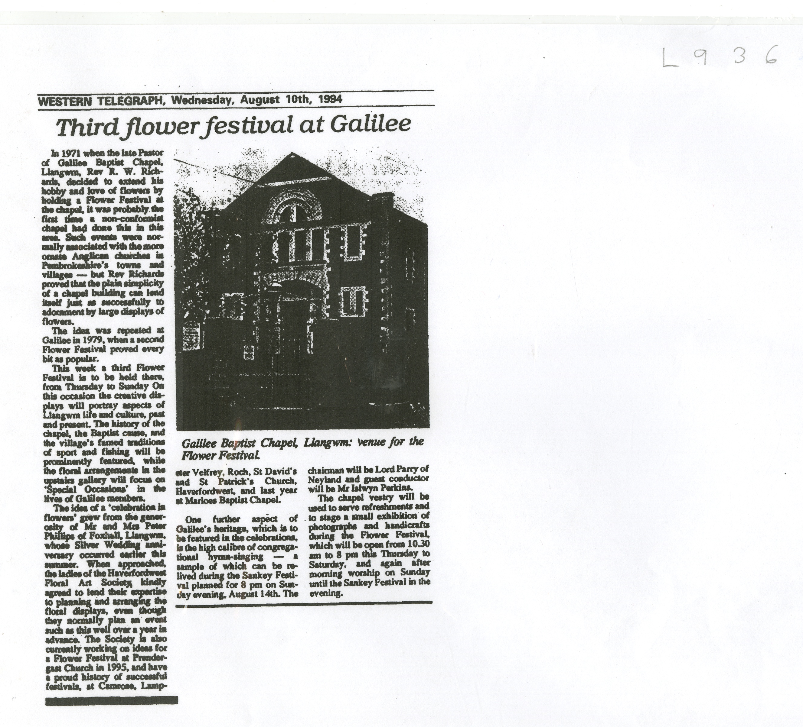Description: Photocopy of a Western Telegraph newspaper article detailing the third flower festival at Galilee. 1 Item.
