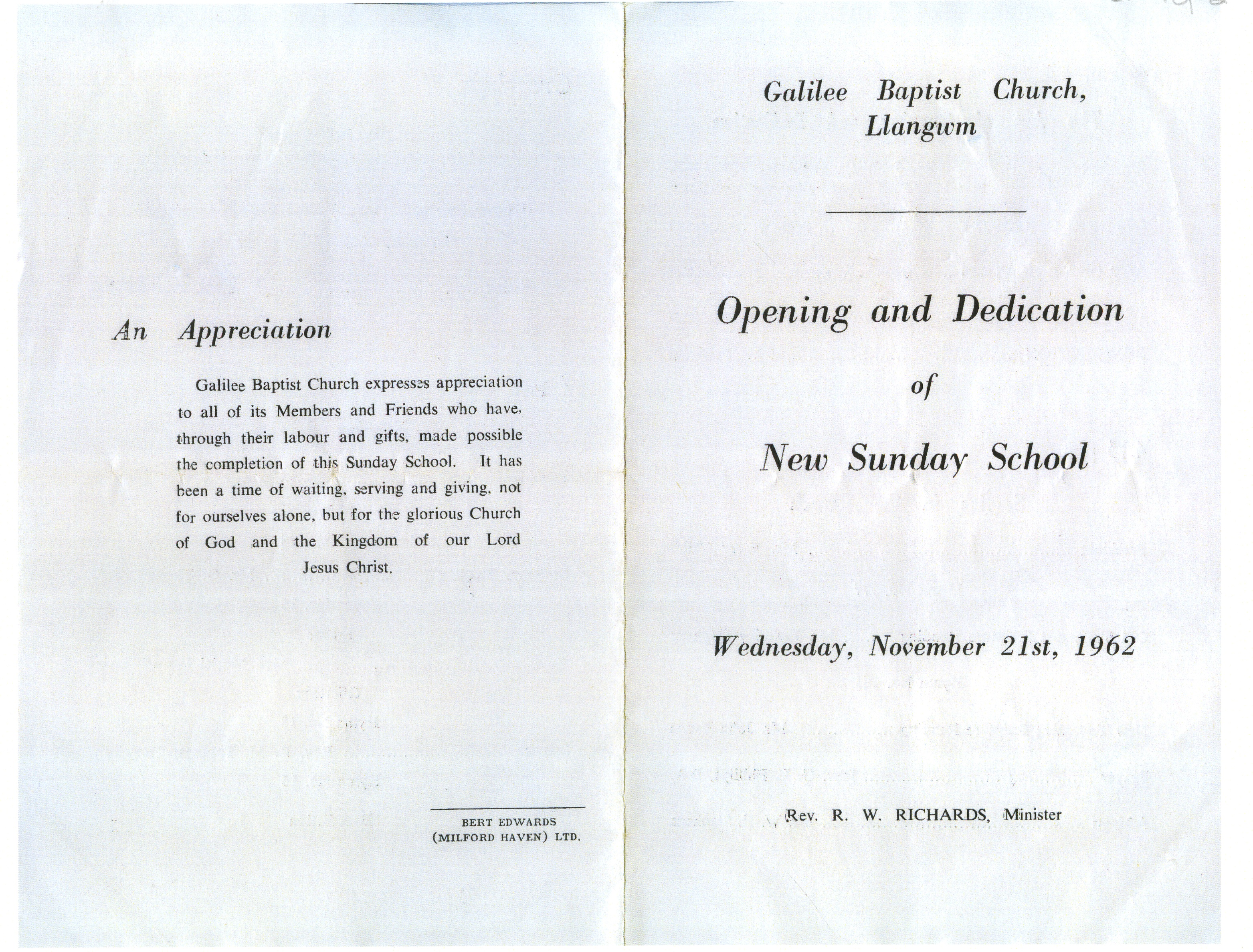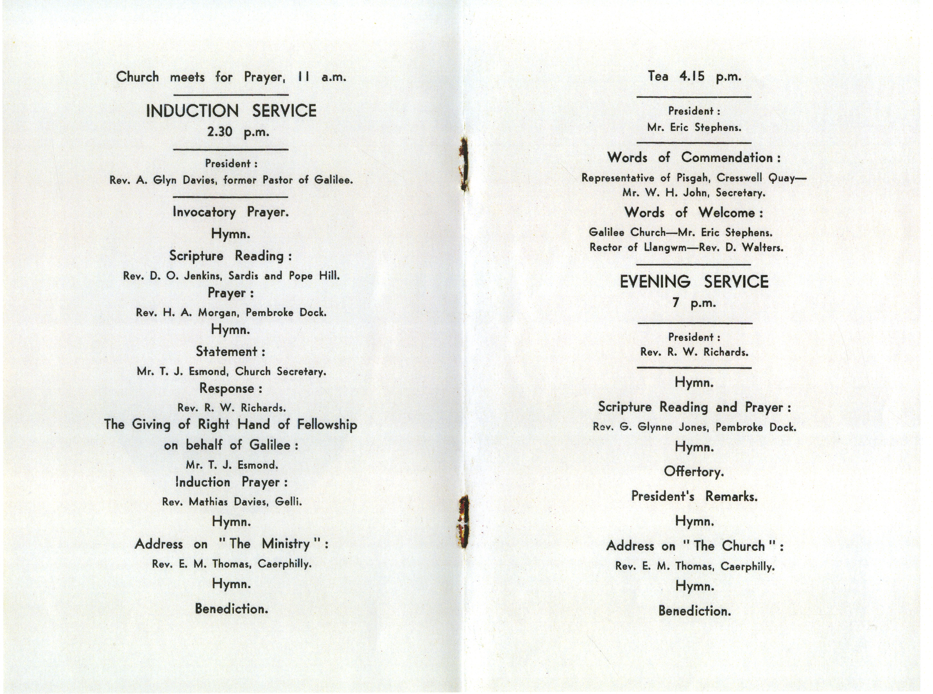 Description: Copy of the induction of the Reverend R W Richards of Pisgah Quay to the Ministry of Galilee Baptist Church Llangwm Pembrokeshire. Pastor Rev R W Richards, Secretary Mr T J Esmond, Canon Jones, Rev W Martland, Rev J A Davies, Rev J T Jones, Rev B Jones, Rev James Thomas, Rev A Glyn Davies, Rev D O Jenkins, Rev Prof Emlyn Davies, Rev T M Jones, Rev W H Williams, Mr George Barrah, Mr George Roach, Mr George Phillips, Mr Eric Stephens, Mrs T J Esmond, Mr T Davies, Mr W G Llewellyn, Mr A J Davies, Rev D J Michale, Mr Phillip Hancock.