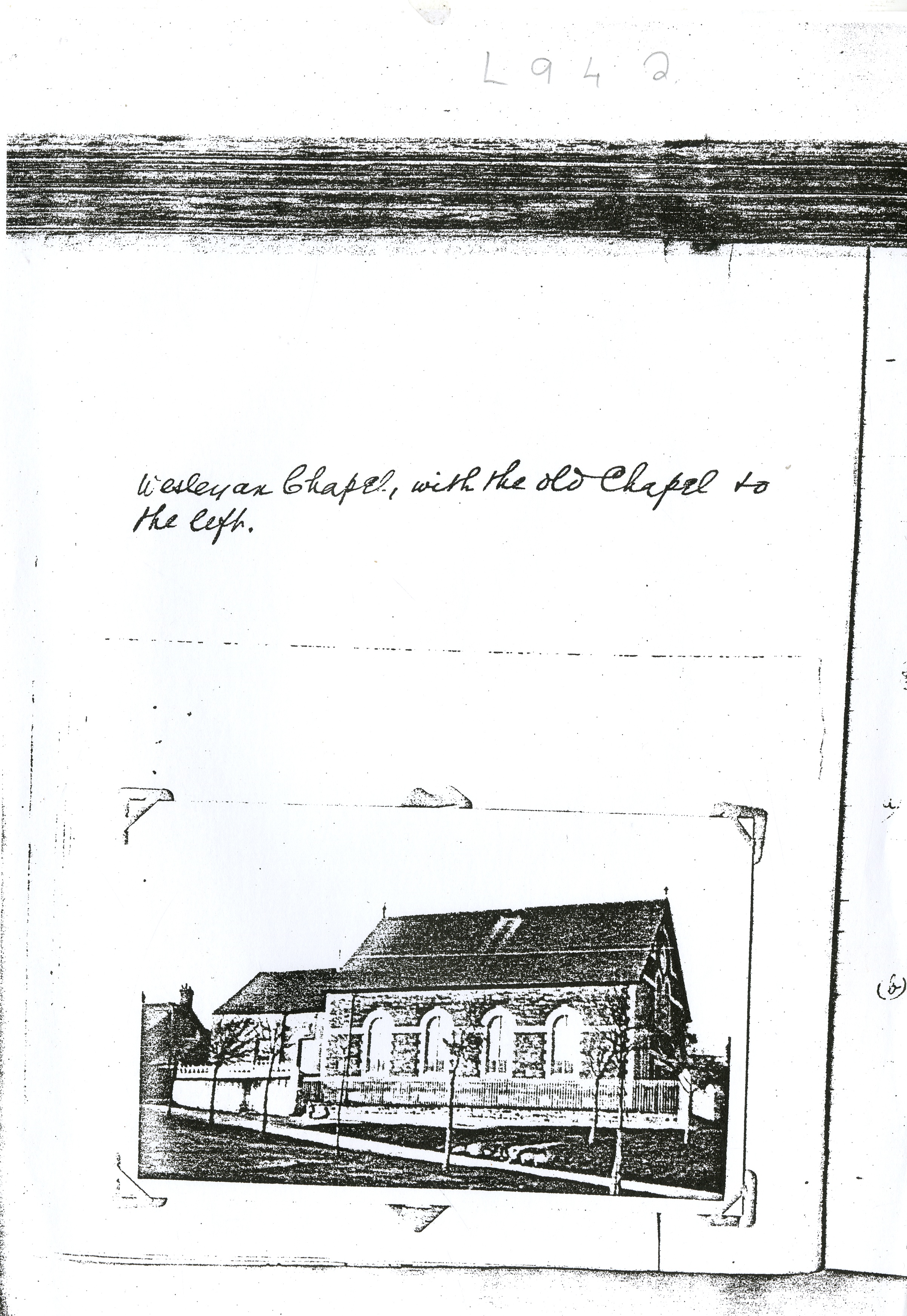 Description: Poor quality copy image of Llangwm Wesleyan Methodist Chapel with the old chapel also features in the image. Item appears to have been removed from L_9_1_7. 1 item.
