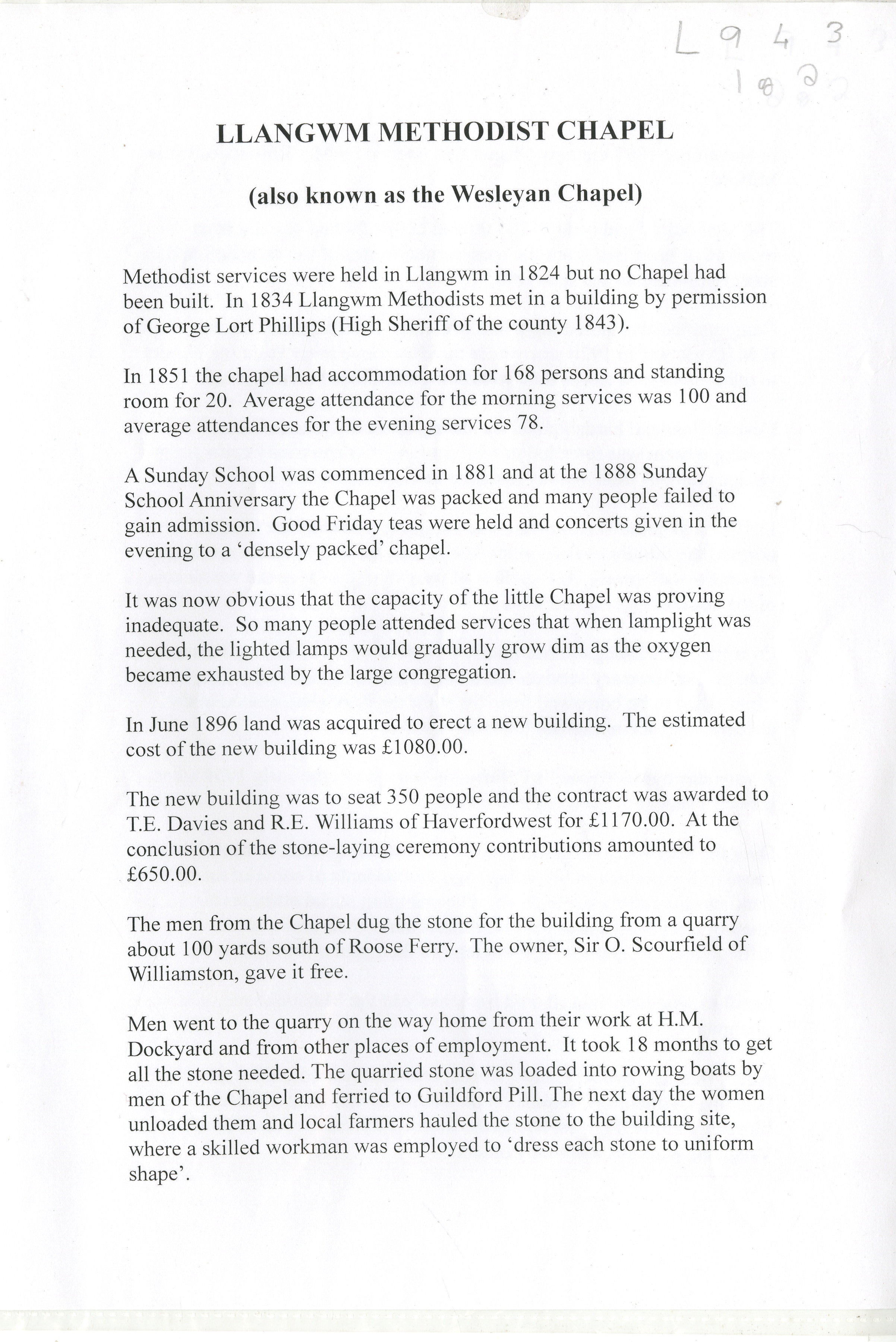 Description: Brief 2 page typed history of Llangwm Methodist Chapel (also known as the Wesleyan Chapel). 1 item