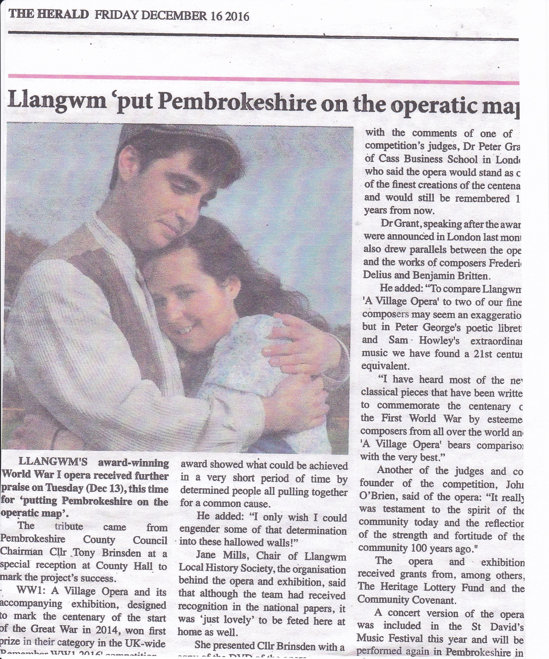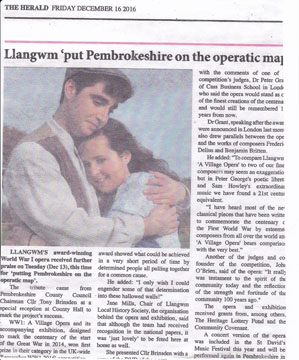 Llangwm 'put Pembrokeshire on the operatic map' - The Herald, 16th December 2016