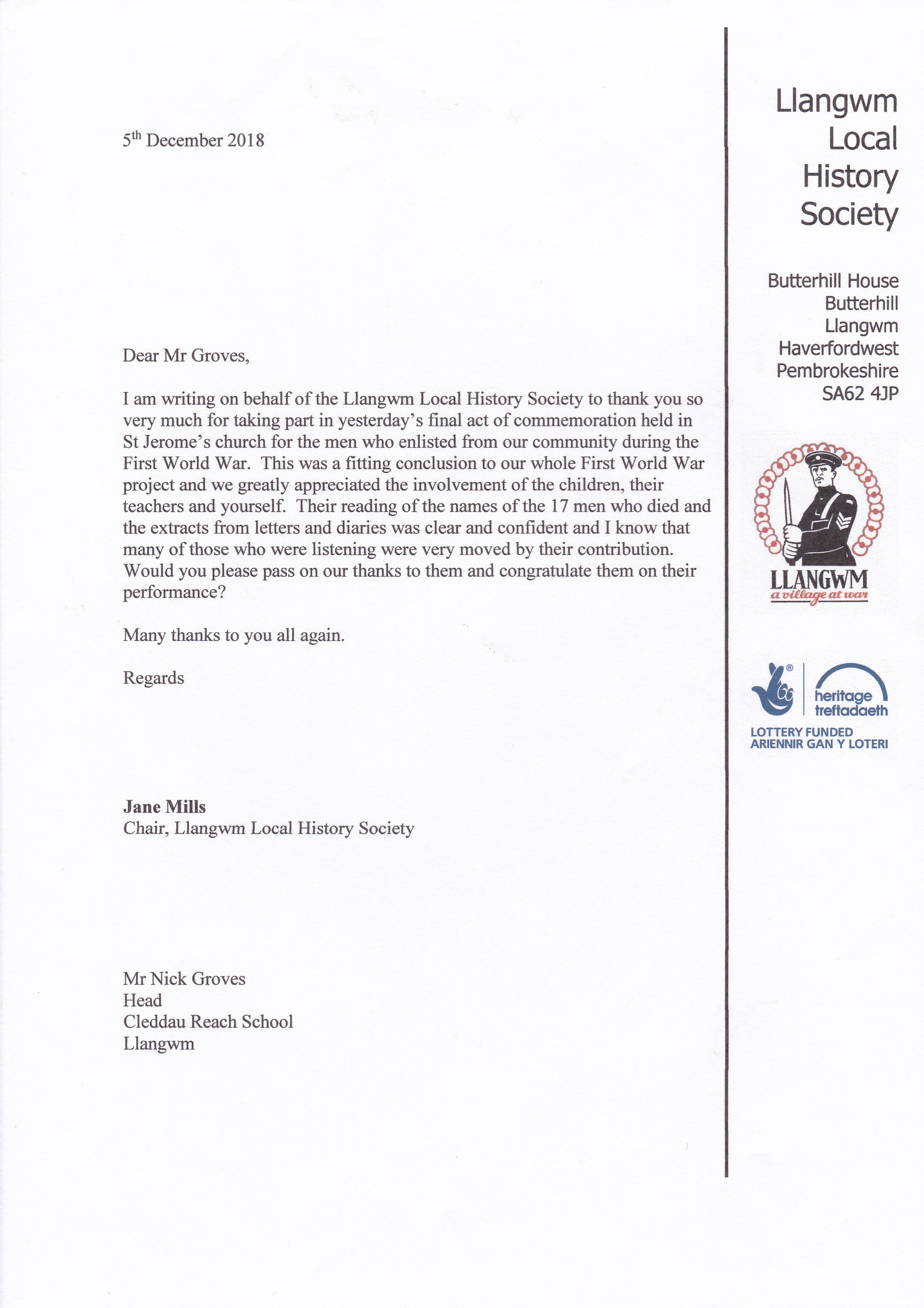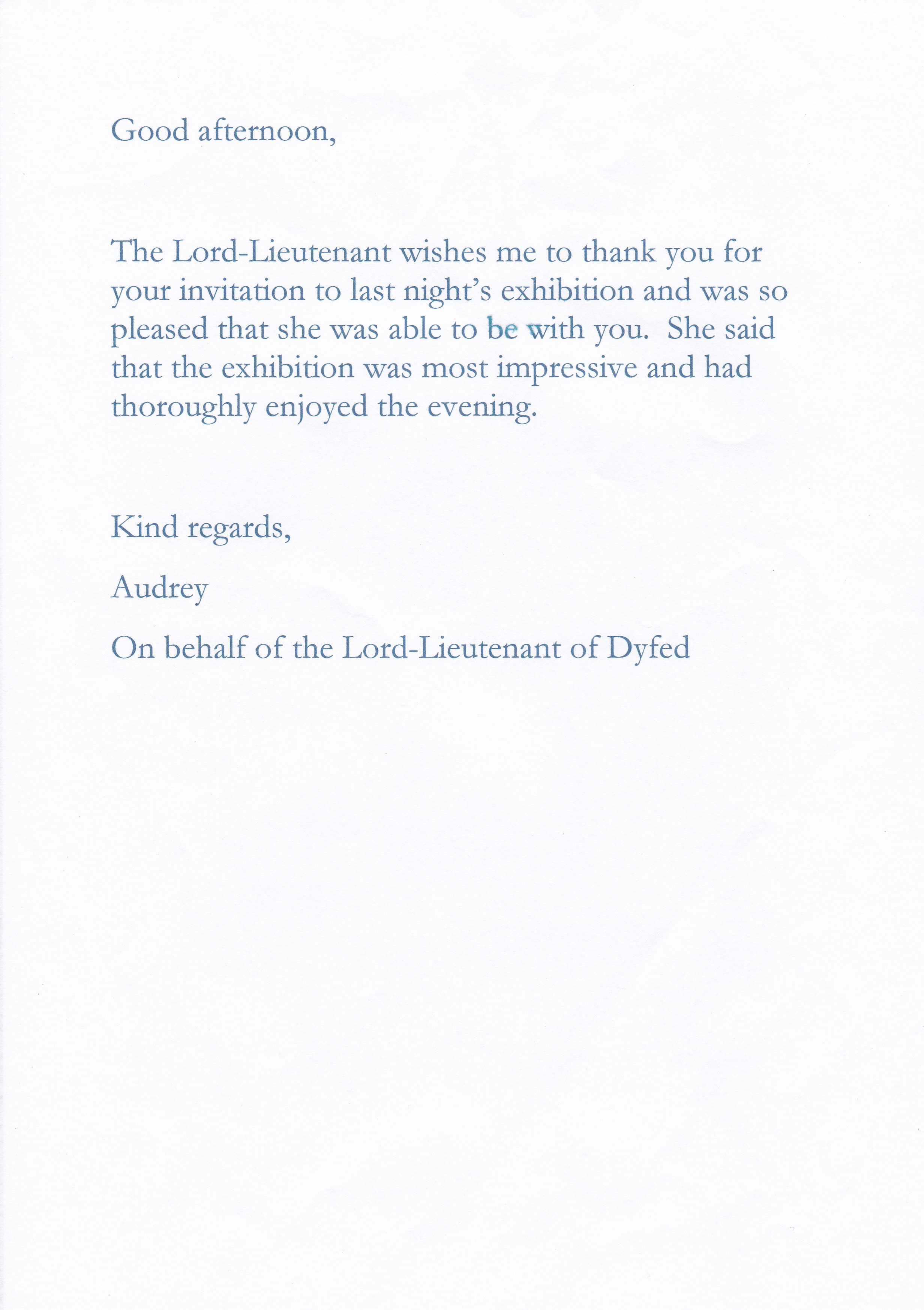 Thank you note from Sara Edwards, Lord-Lieutenant of Dyfed