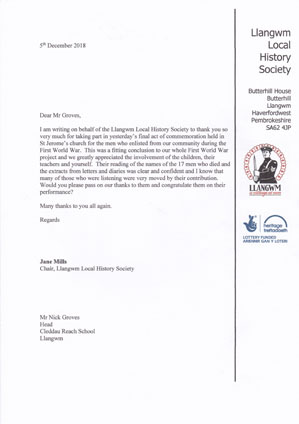 Research uncovered no fewer than five sets of brothers from the Llangwm area who served their country. The John family from Llangwm had emigrated to Canada ten years before, and in 1914 two of the three sons enlisted in the Canadian Expeditionary Force. In one of the saddest stories to emerge, the older brother Edwin was killed by a sniper at Lens in Northern France in 1917. The younger, James, went to his aid but was killed holding his brother's body.